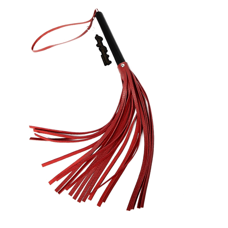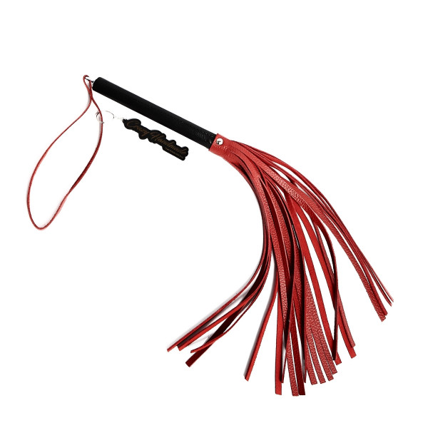 Удобная многохвостная плеть выполнена из натуральной кожи в красном цвете с контрастной черной ручкой