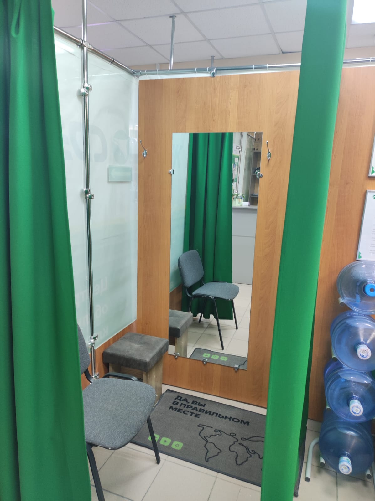Войти в отделение банка Совкомбанк через центральный вход, на 1 этаже расположен постамат