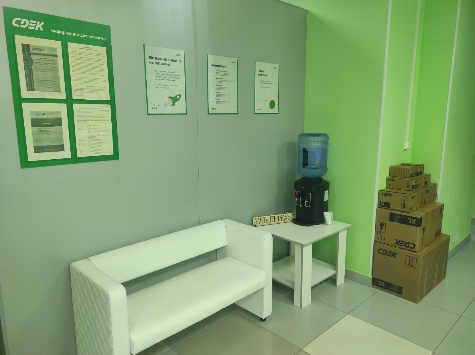 Войти в супермаркет Магнит через центральный вход, на 1 этаже около входа расположен постамат