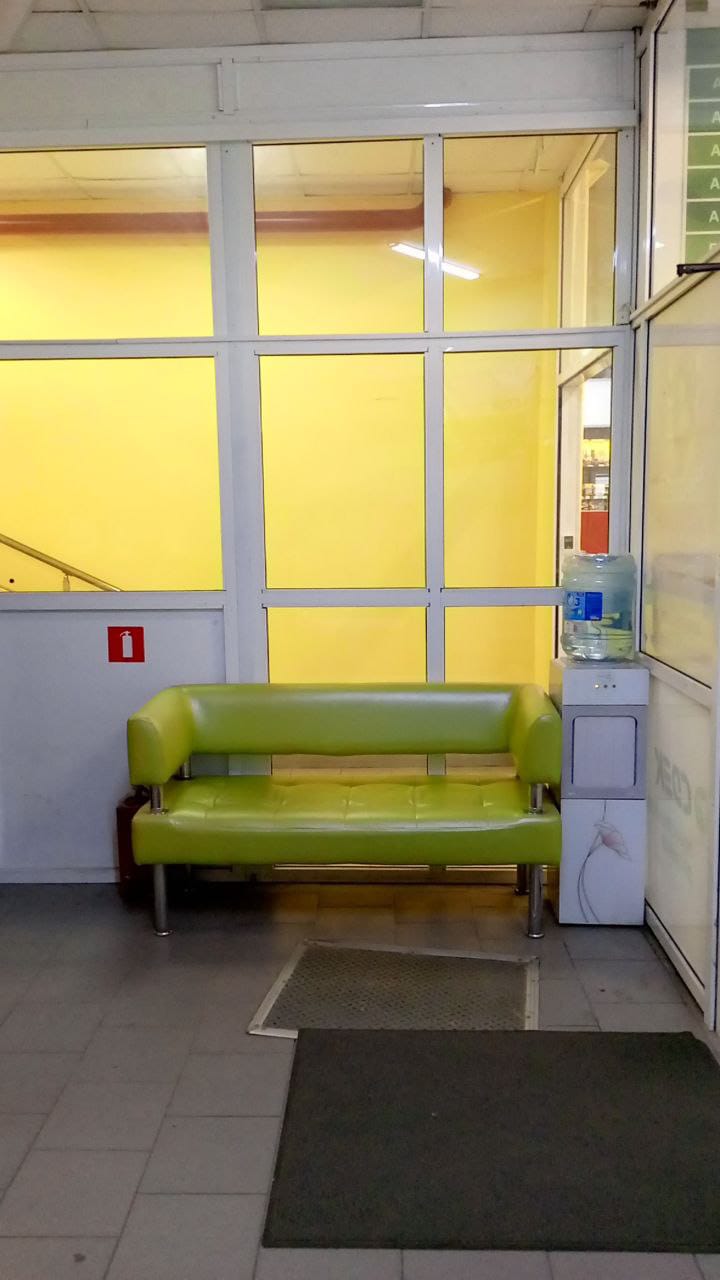 Вход с торца здания с надписью FАБРИКА , рядом с кофейным автоматом