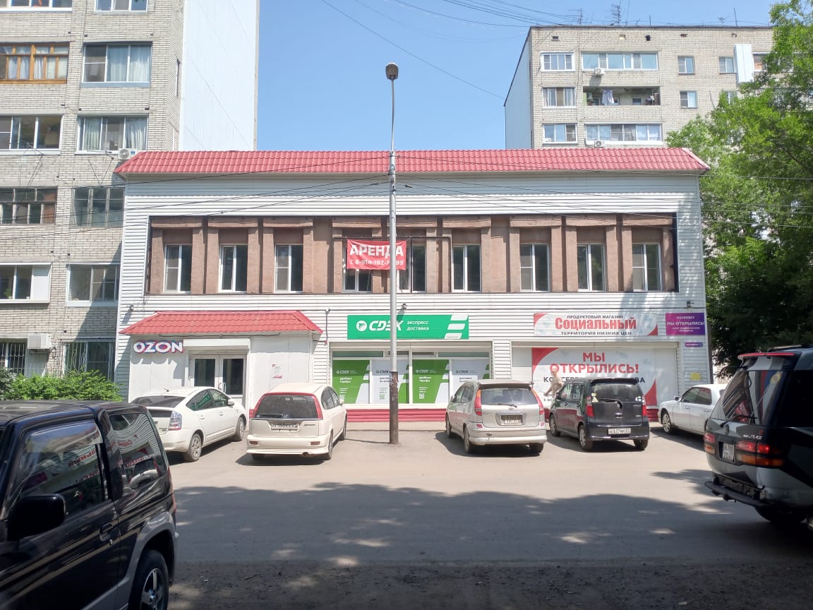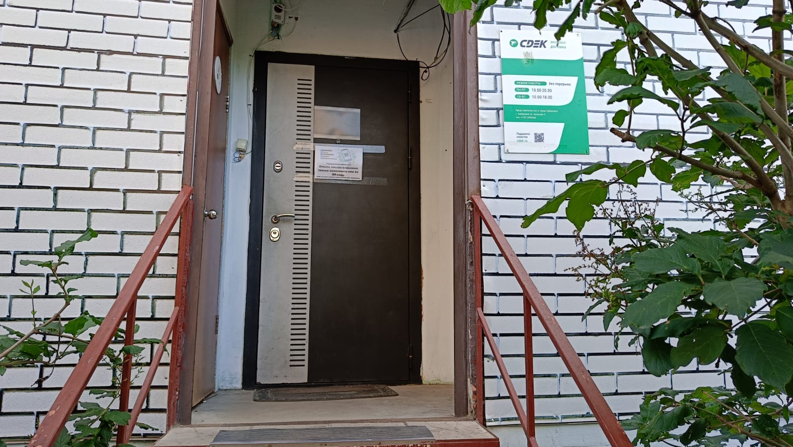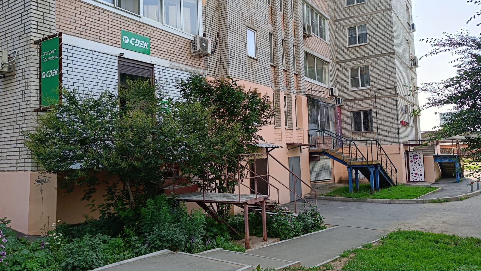 Вход с улицы Краснореченская, отдельное крыльцо с торца жилого высокоэтажного дома.