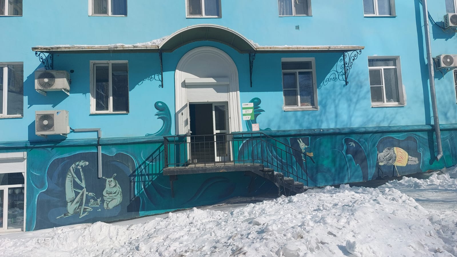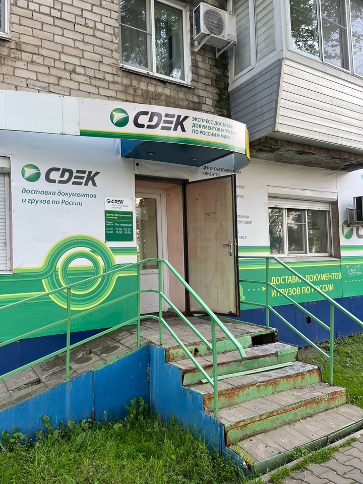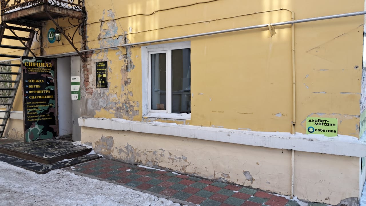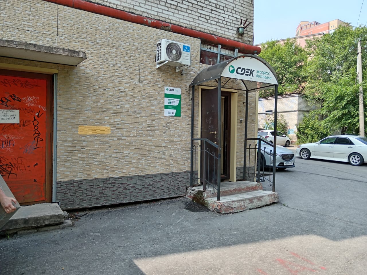 Вход с улицы Краснореченская, отдельное крыльцо с торца жилого высокоэтажного дома.