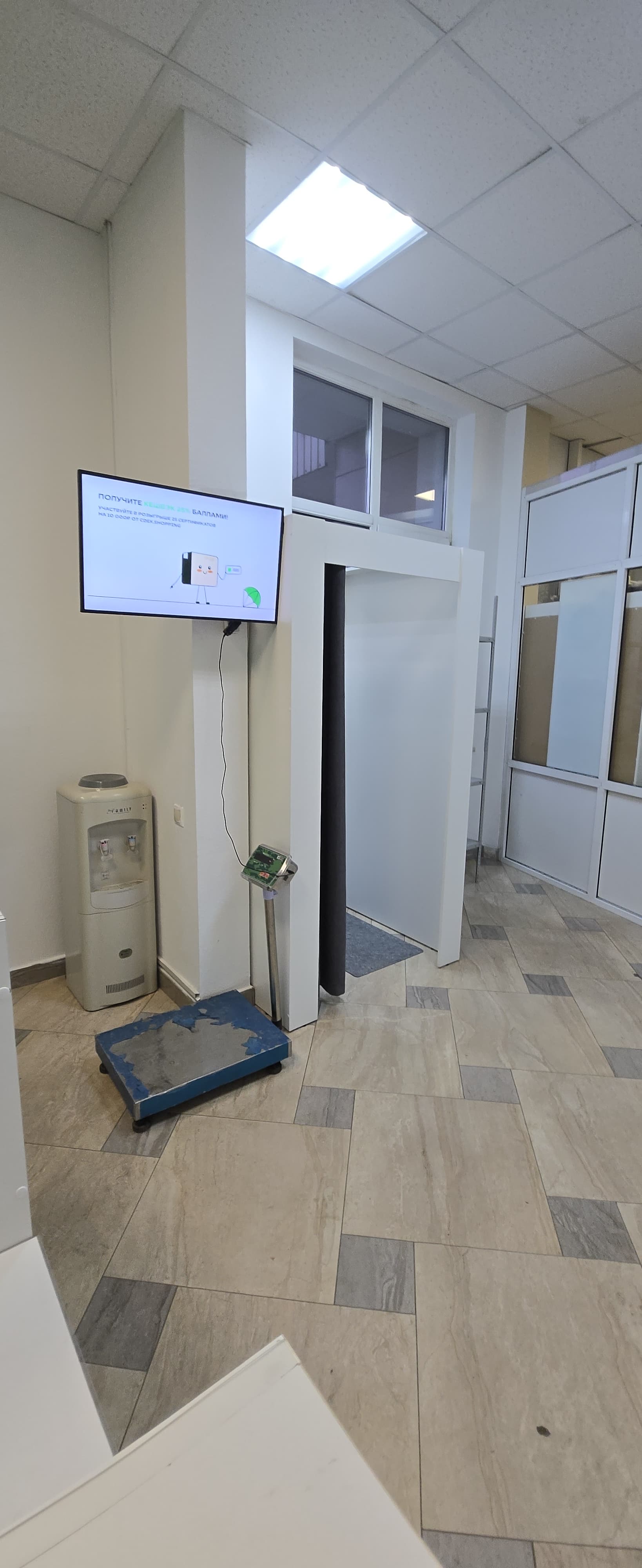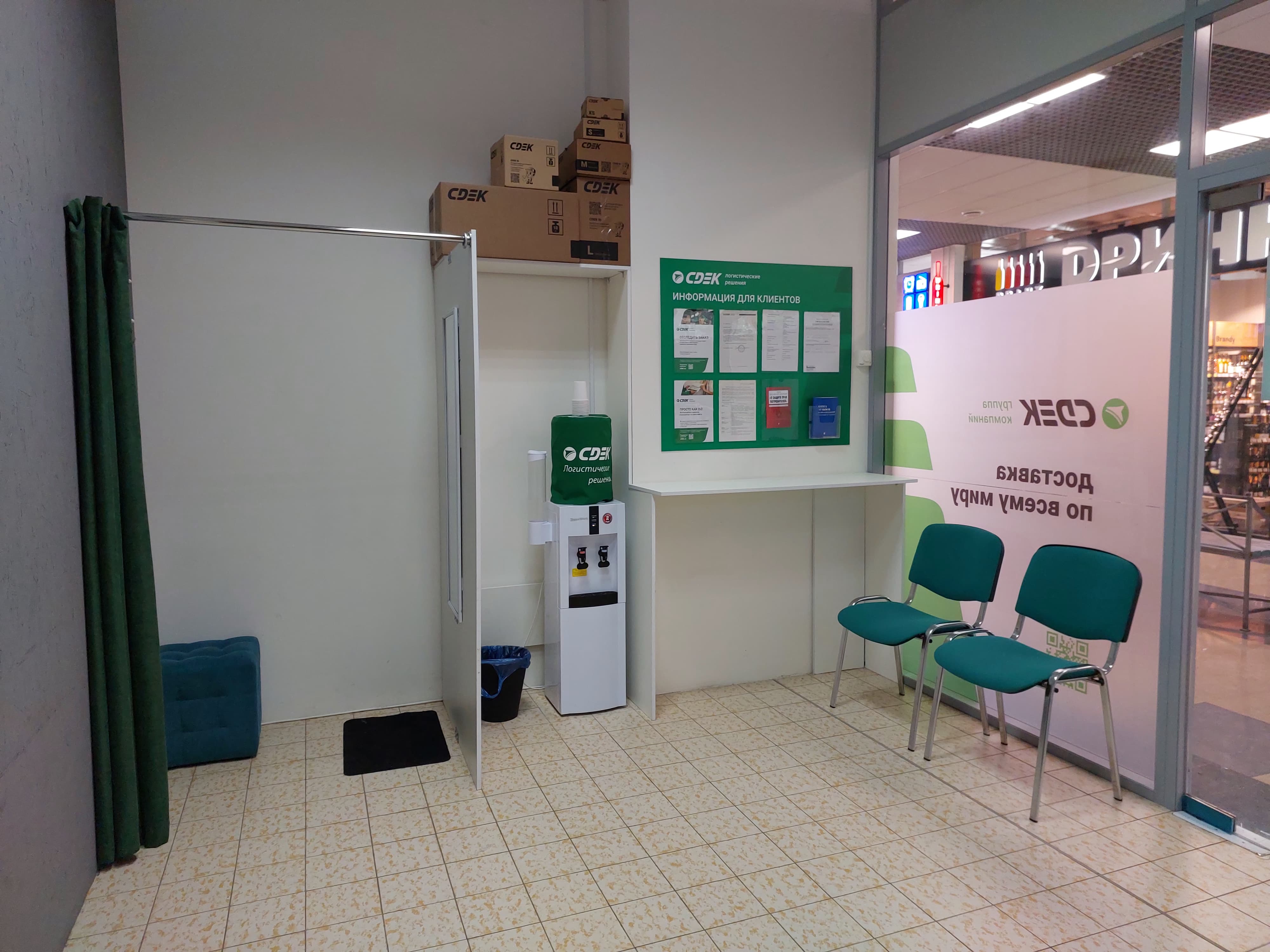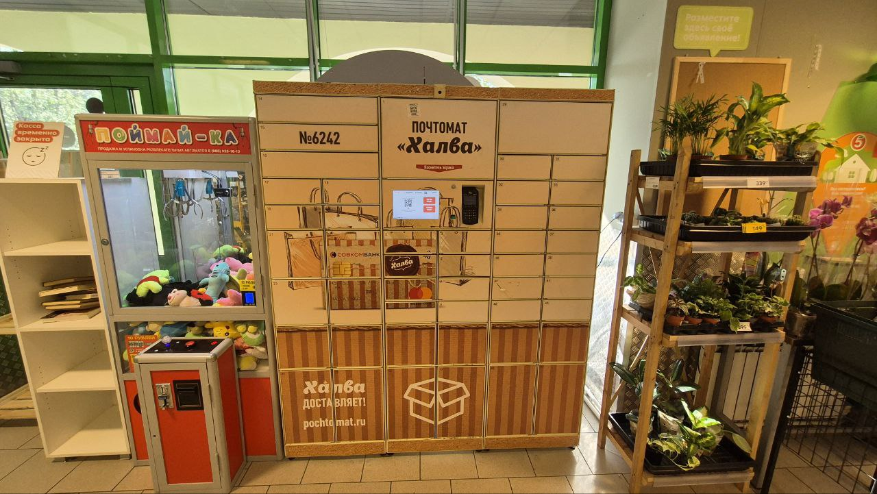 Войти в супермаркет Магнит Косметик через центральный вход, на 1 этаже около входа расположен постамат