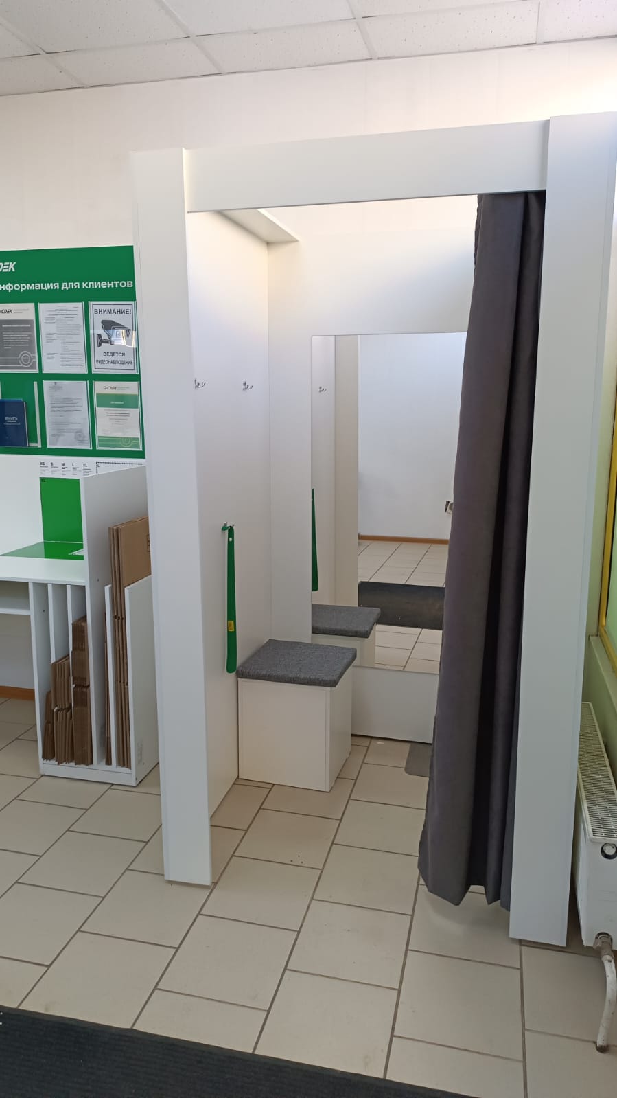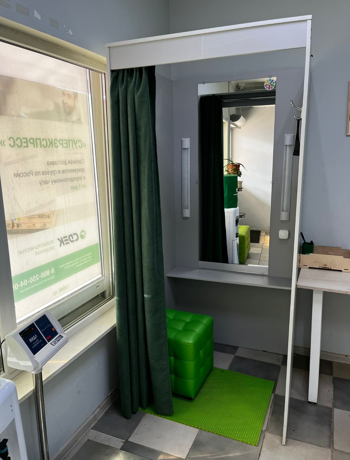 Войти в супермаркет Пятерочка через центральный вход, на 1 этаже около входа расположен постамат.