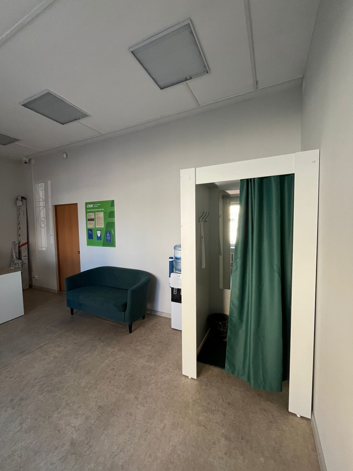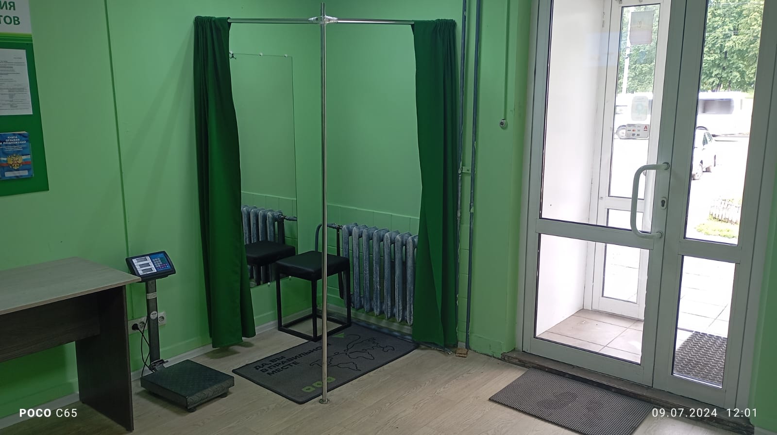 Войти в отделение банка Совкомбанк через центральный вход, на 1 этаже расположен постамат.