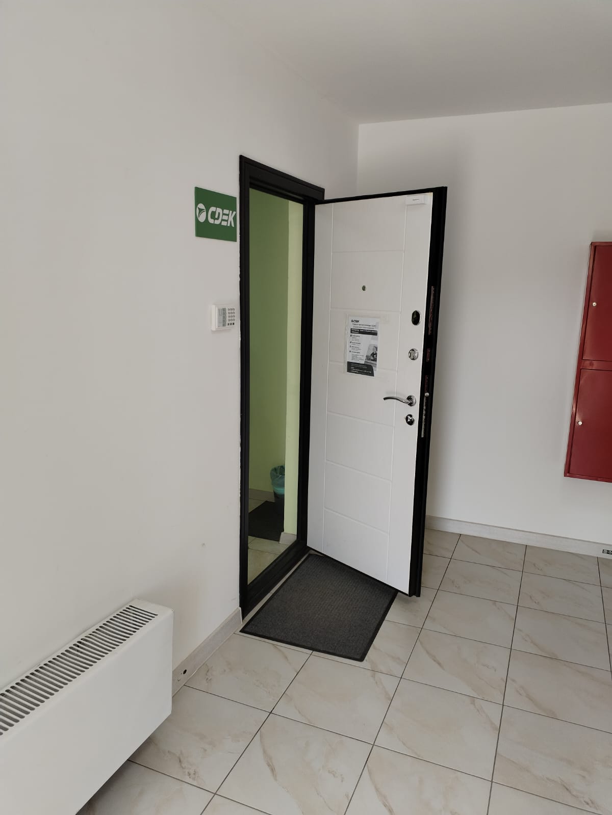 Слева от ТЦ Триумф Плаза через детскую площадку второй многоэтажный дом. Вход — крыльцо в жилом высокоэтажном доме, крыльцо на территории стоянки.