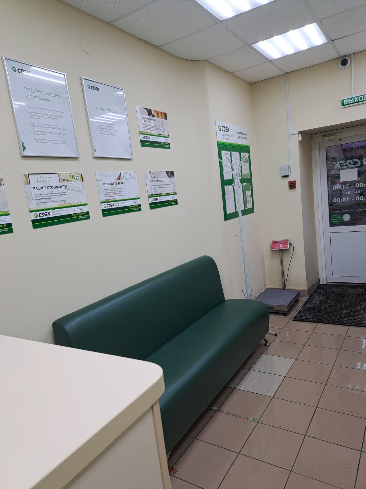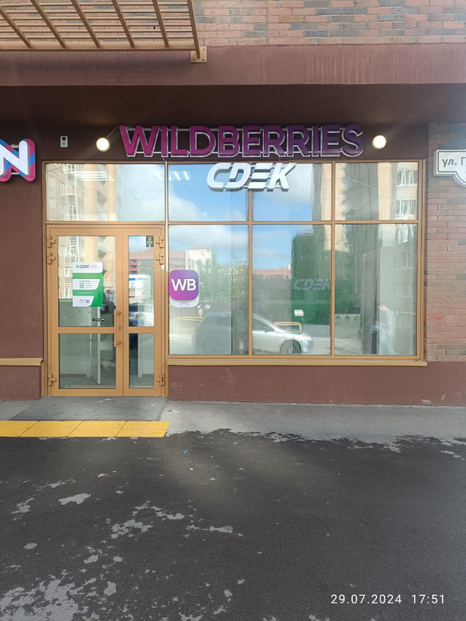 Вход в пункт выдачи находится по центру здания, со стороны ул. Карпинского, Вывеска СДЭК