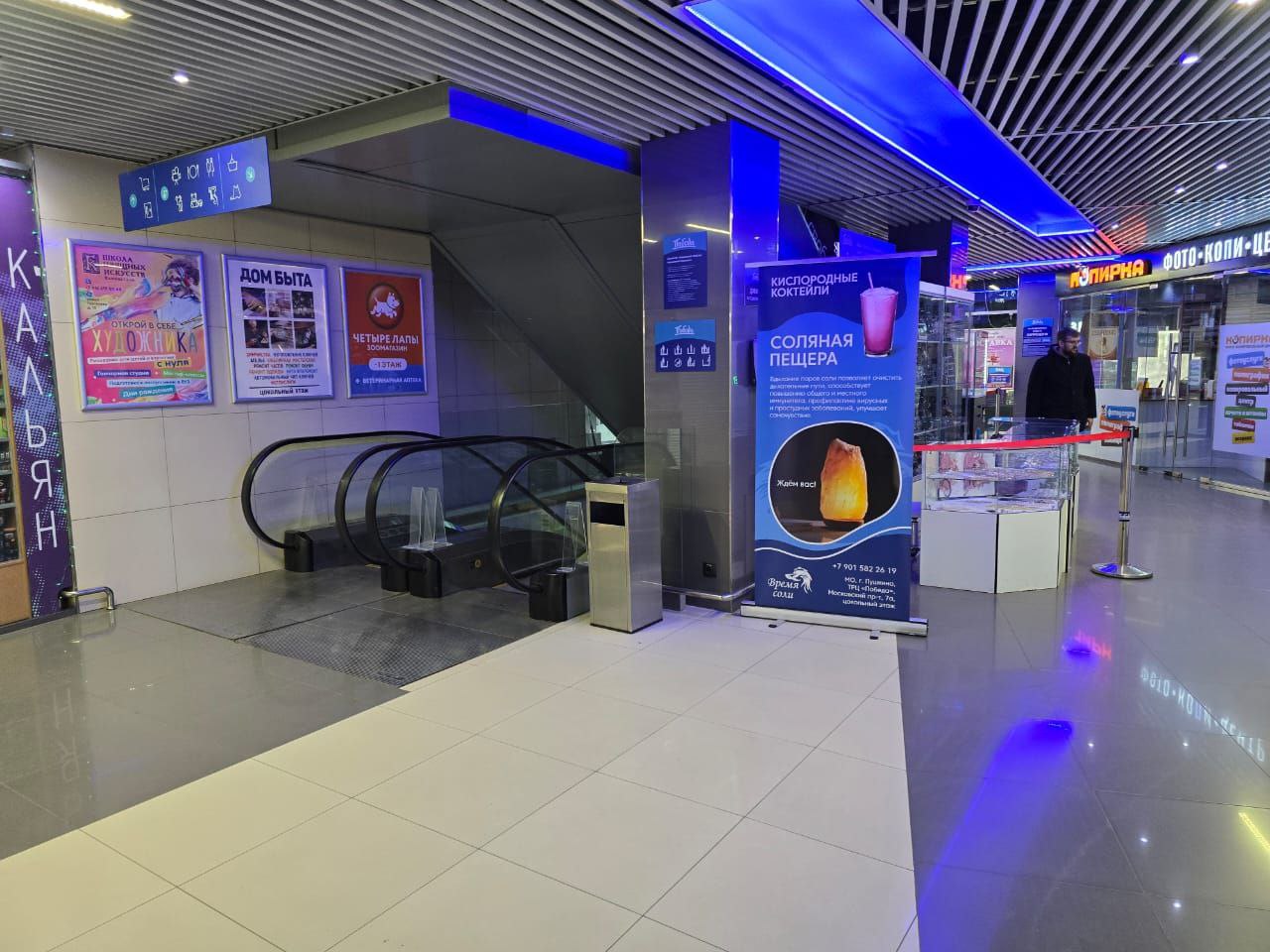 Войти в ТРЦ "Победа" через центральный вход, повернуть направо, спуститься на цокольный этаж на эскалаторе, повернуть направо.