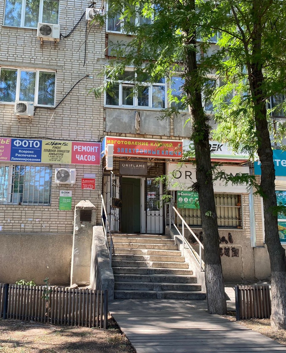 За магазином Магнит. Вход — пристройка к жилому высокоэтажному дому, крыльцо выходит на пр.Стачки.