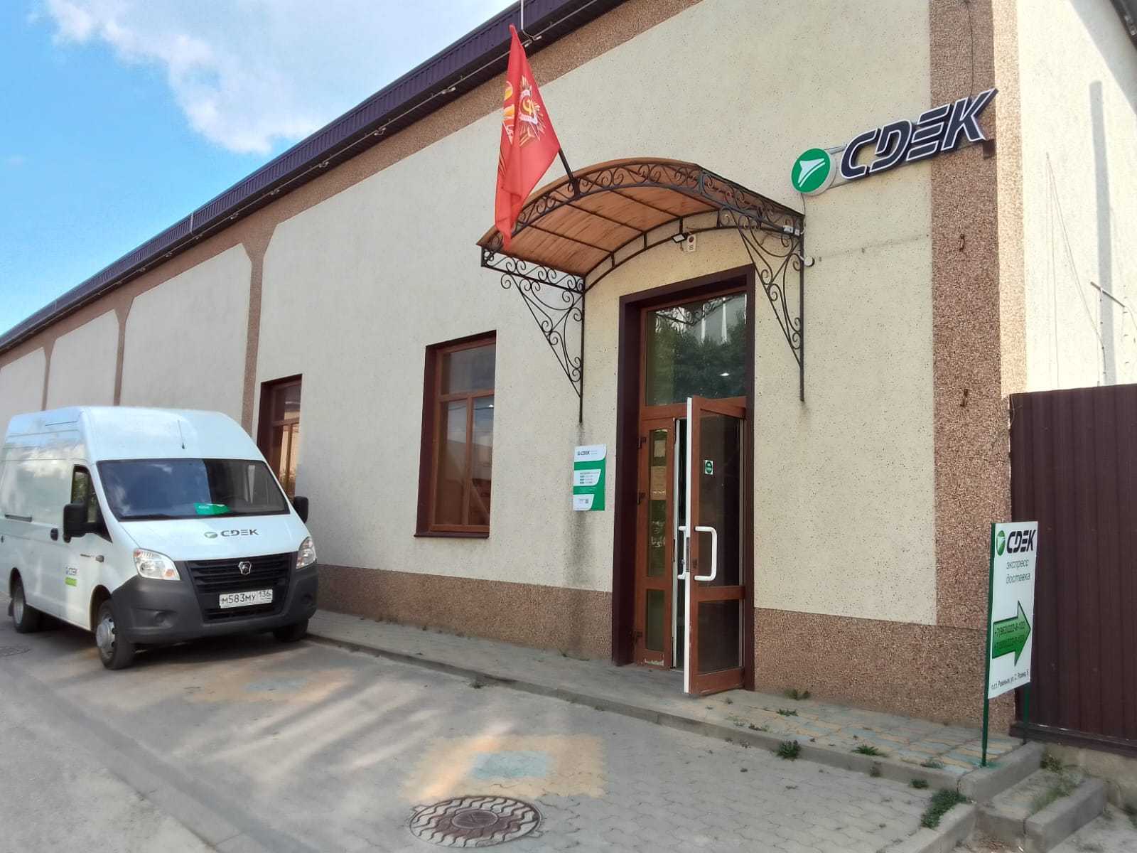 По ул. С.Разина, после "МФЦ-Мои документы", не доходя стоматологии будет указатель со стрелкой направления офиса СДЭК. Двигаемся по направлению стрелки указателя. Ориентир - кафе