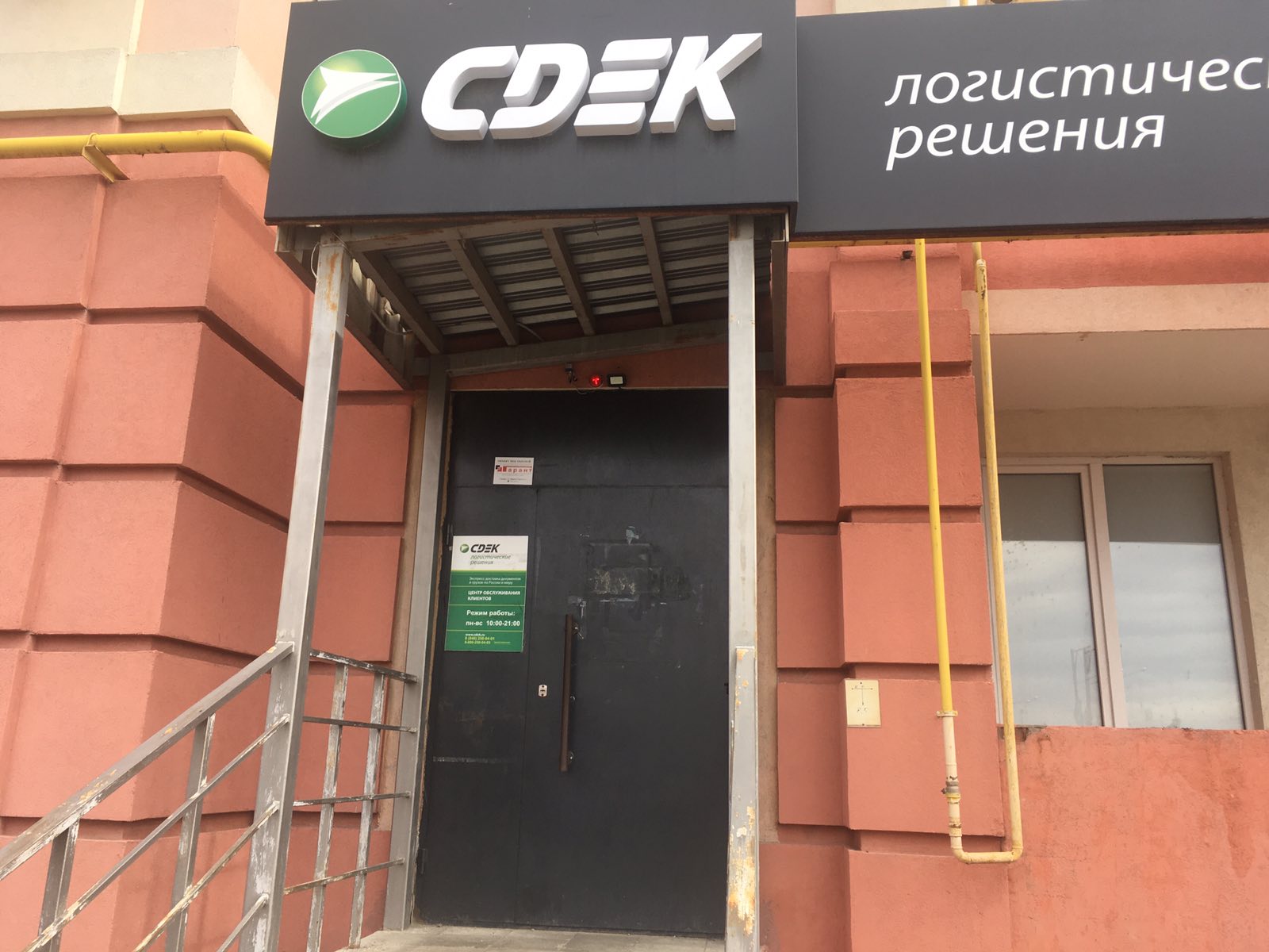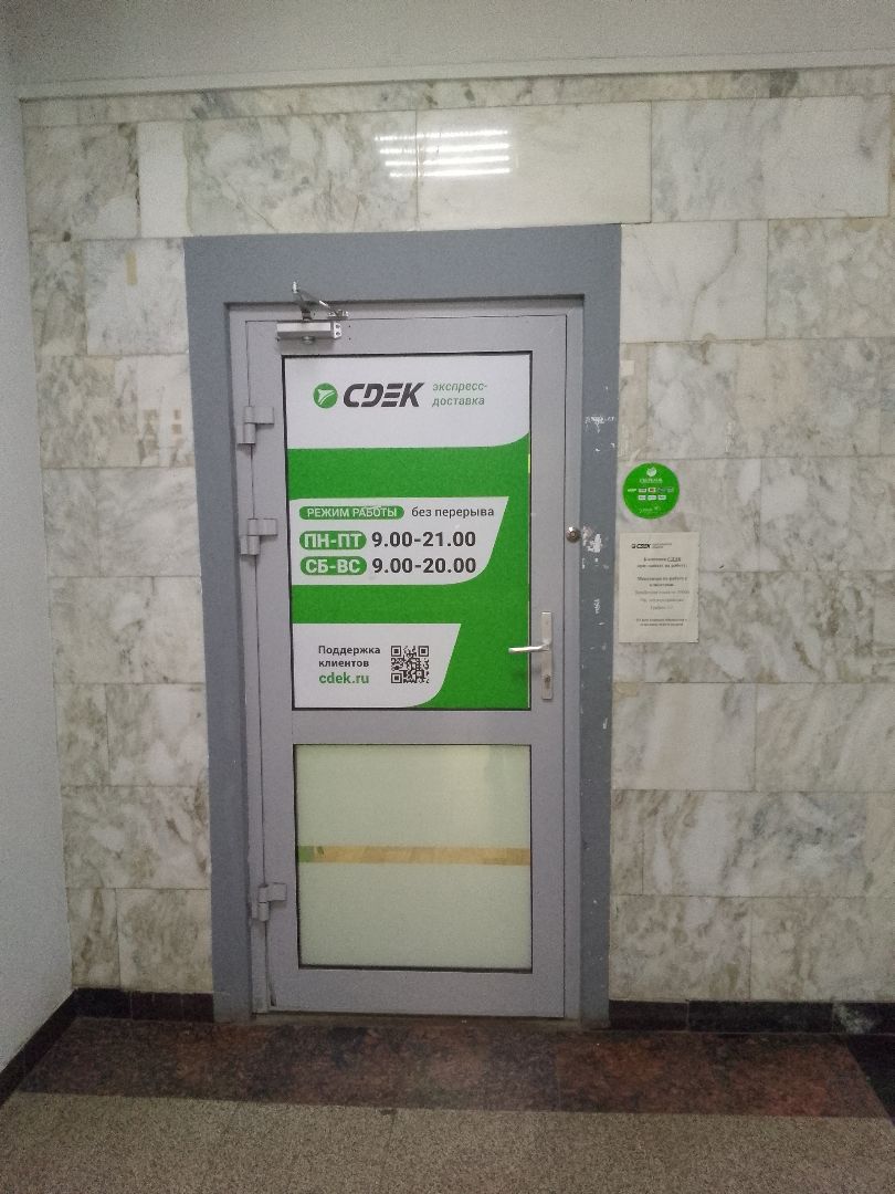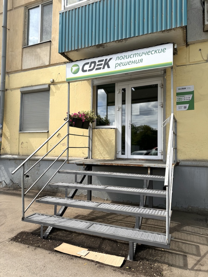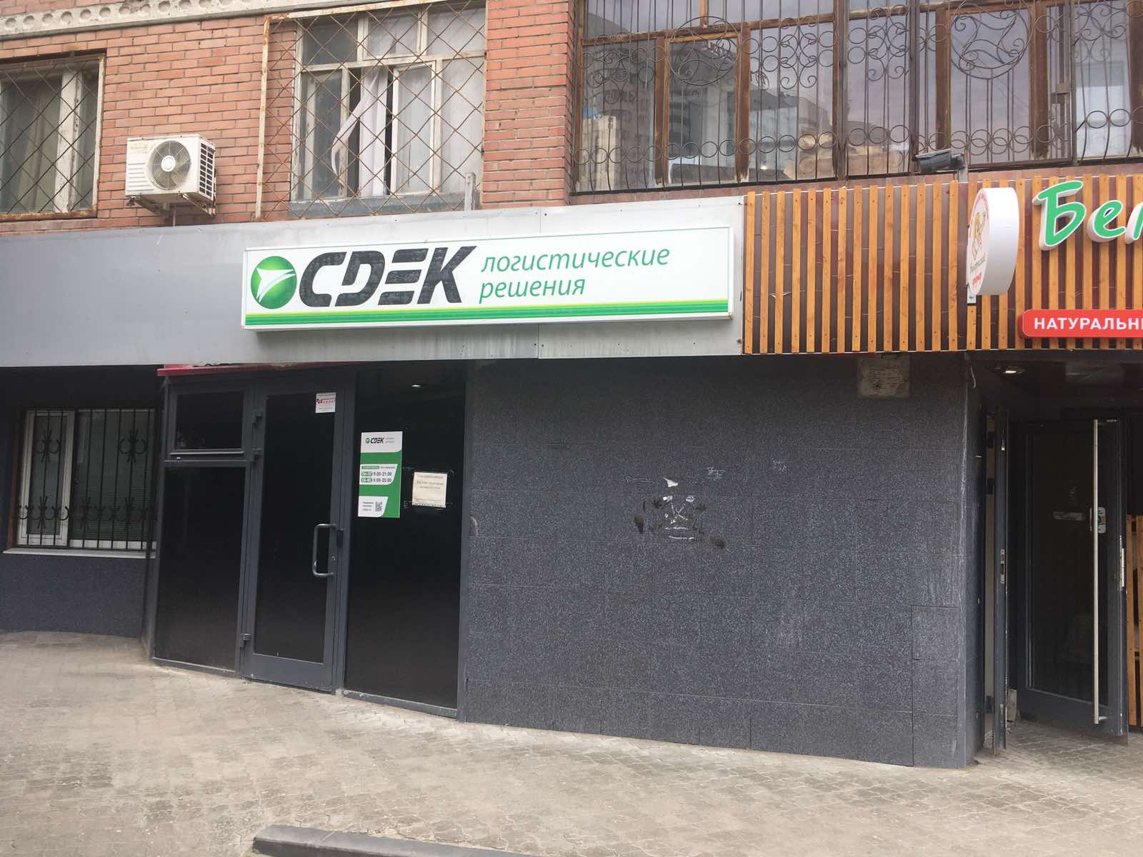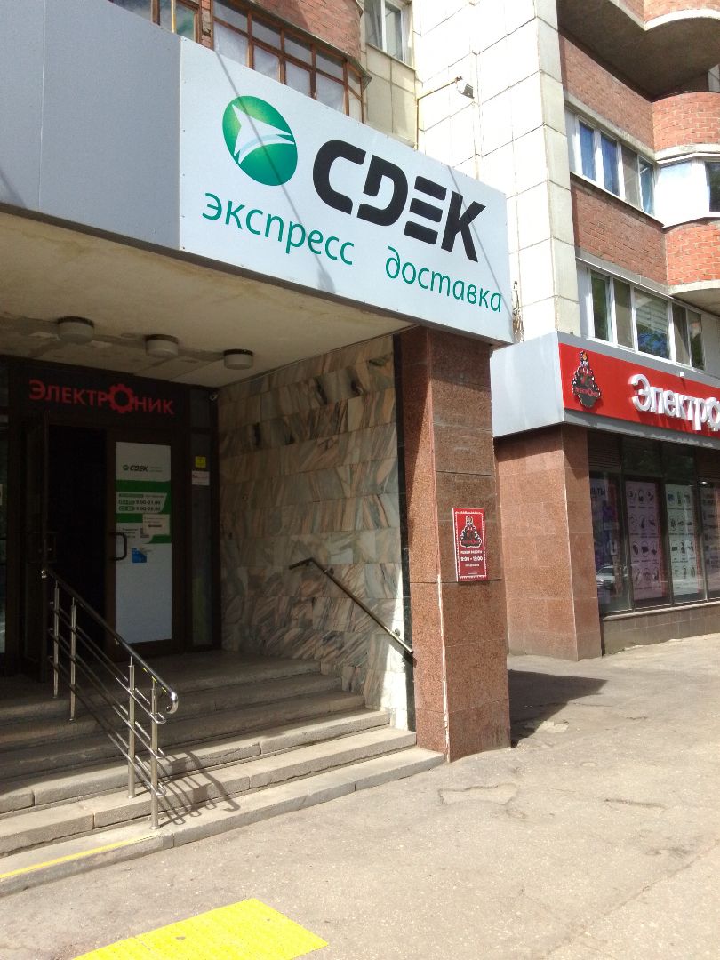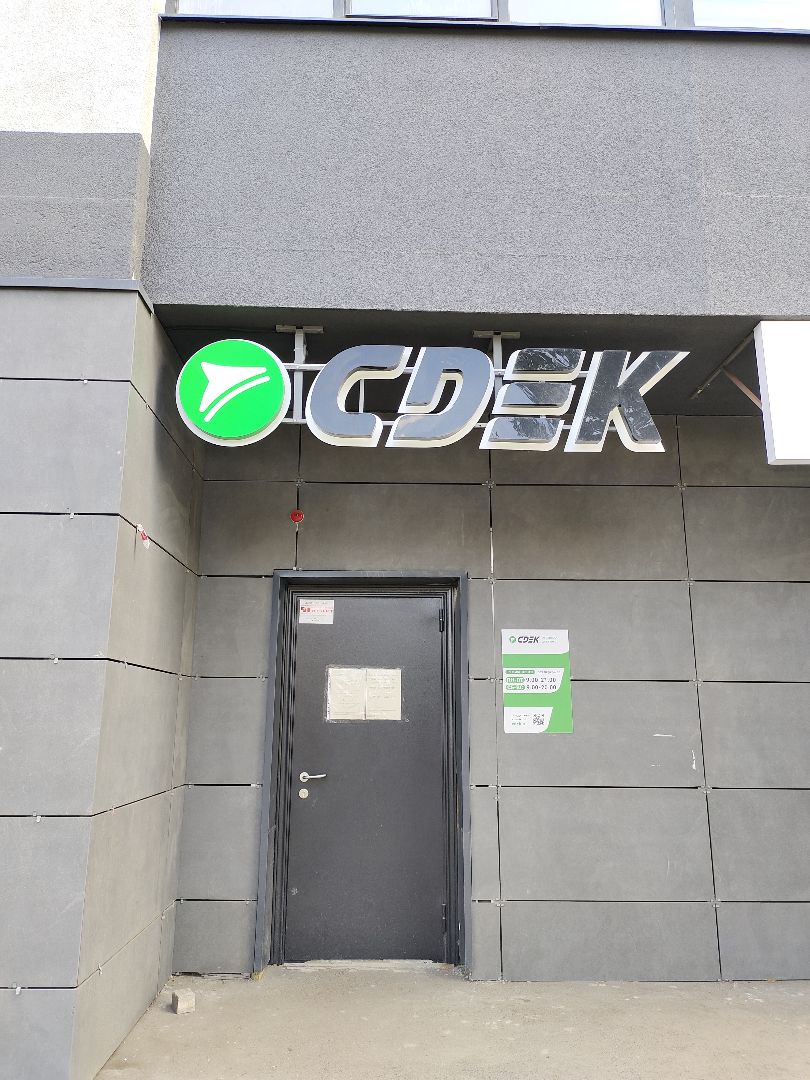 Вход со стороны улицы Молодогвардейской. За рестораном ЧипоЛучо шлагбаум, далее второе крыльцо, над которым висит вывеска СДЭК.