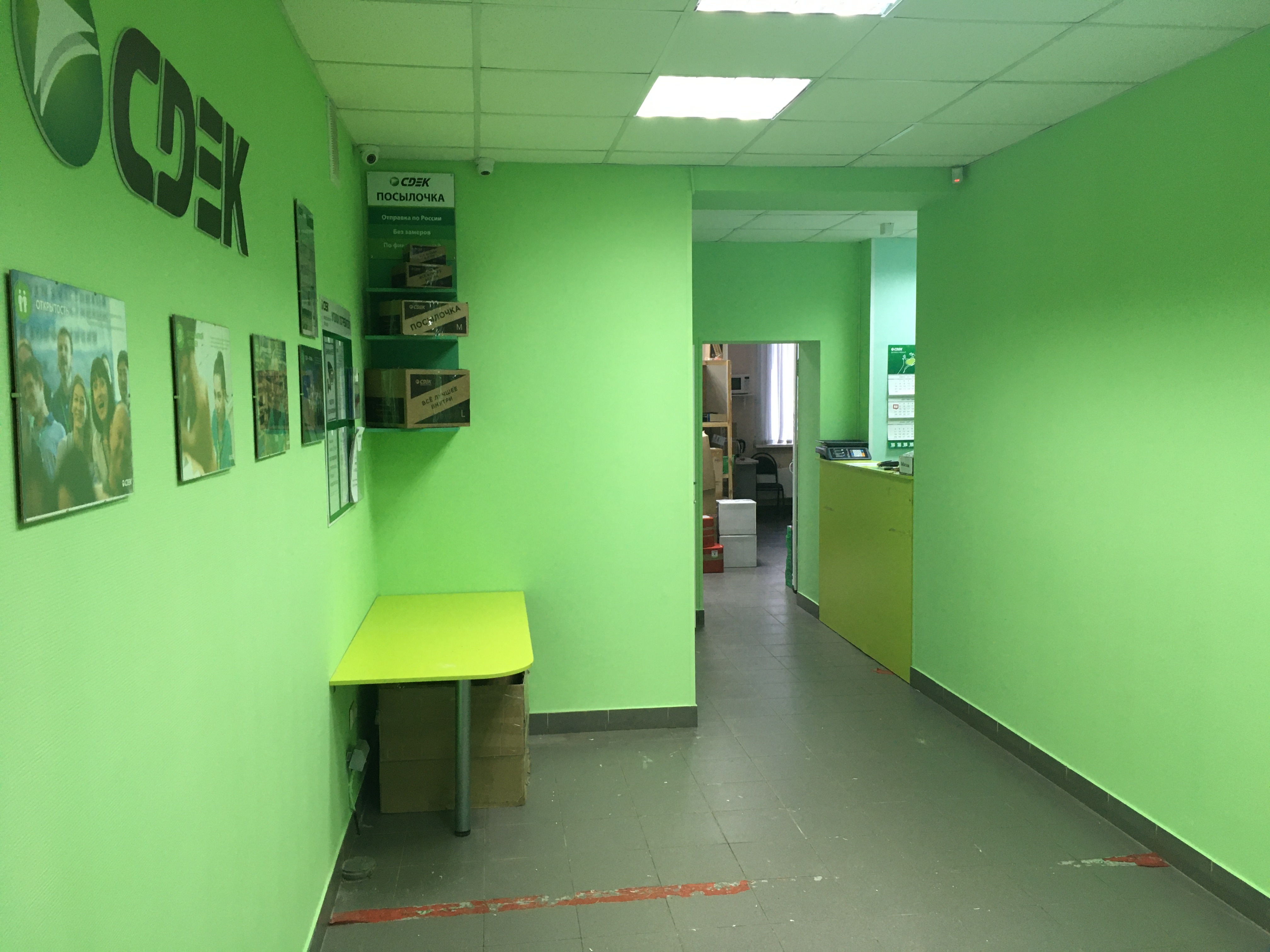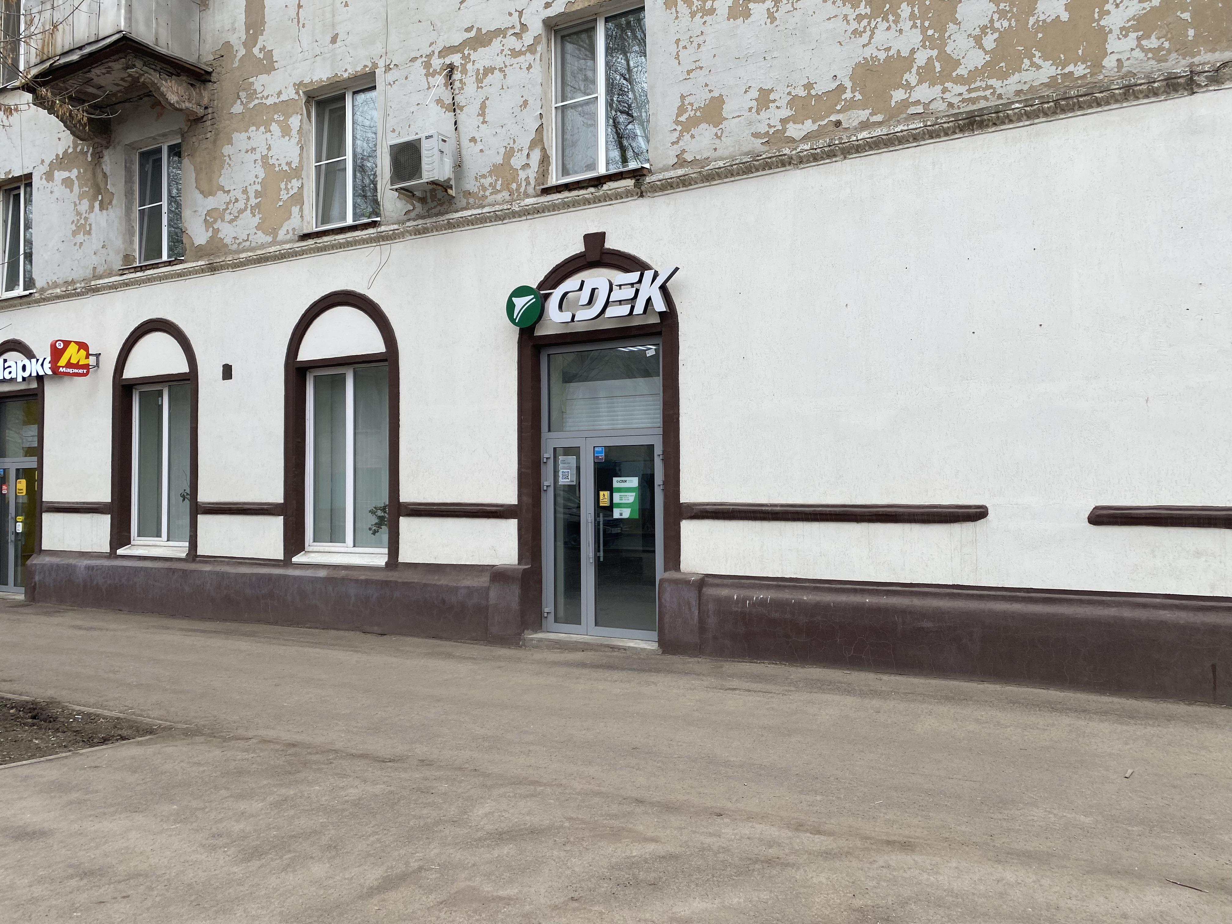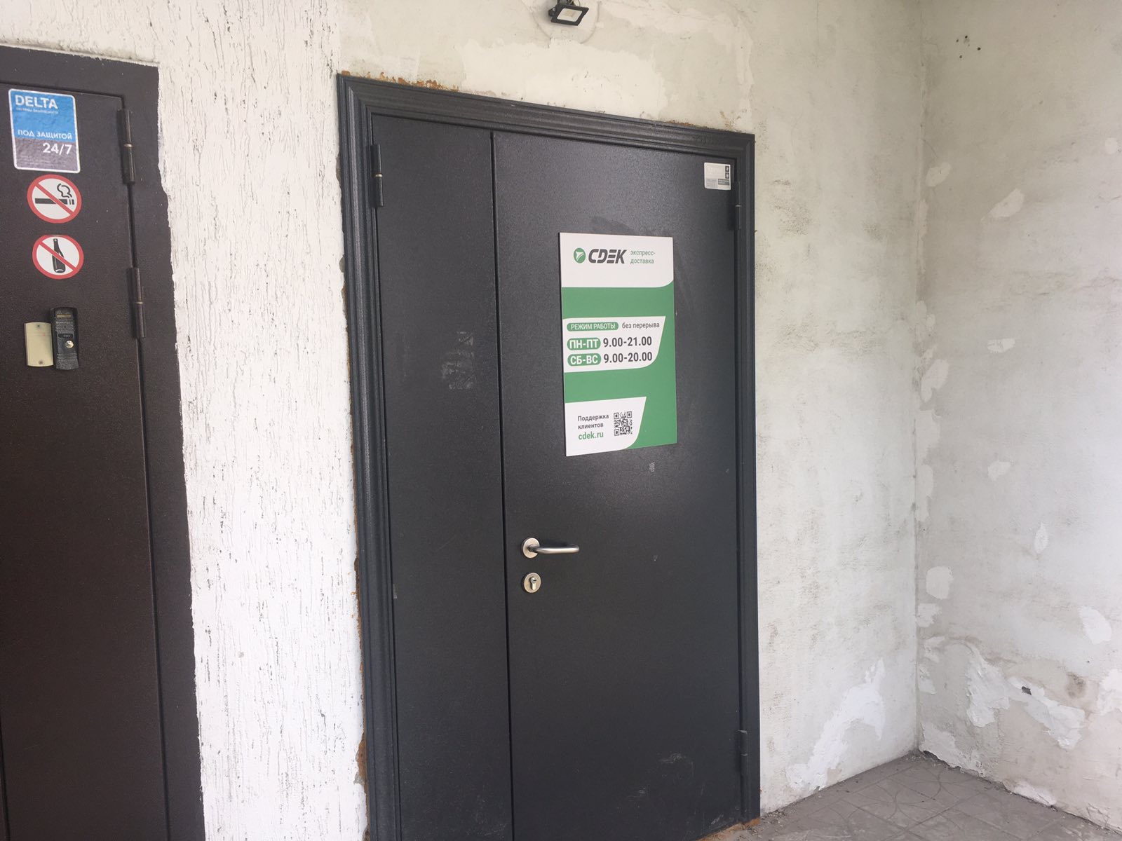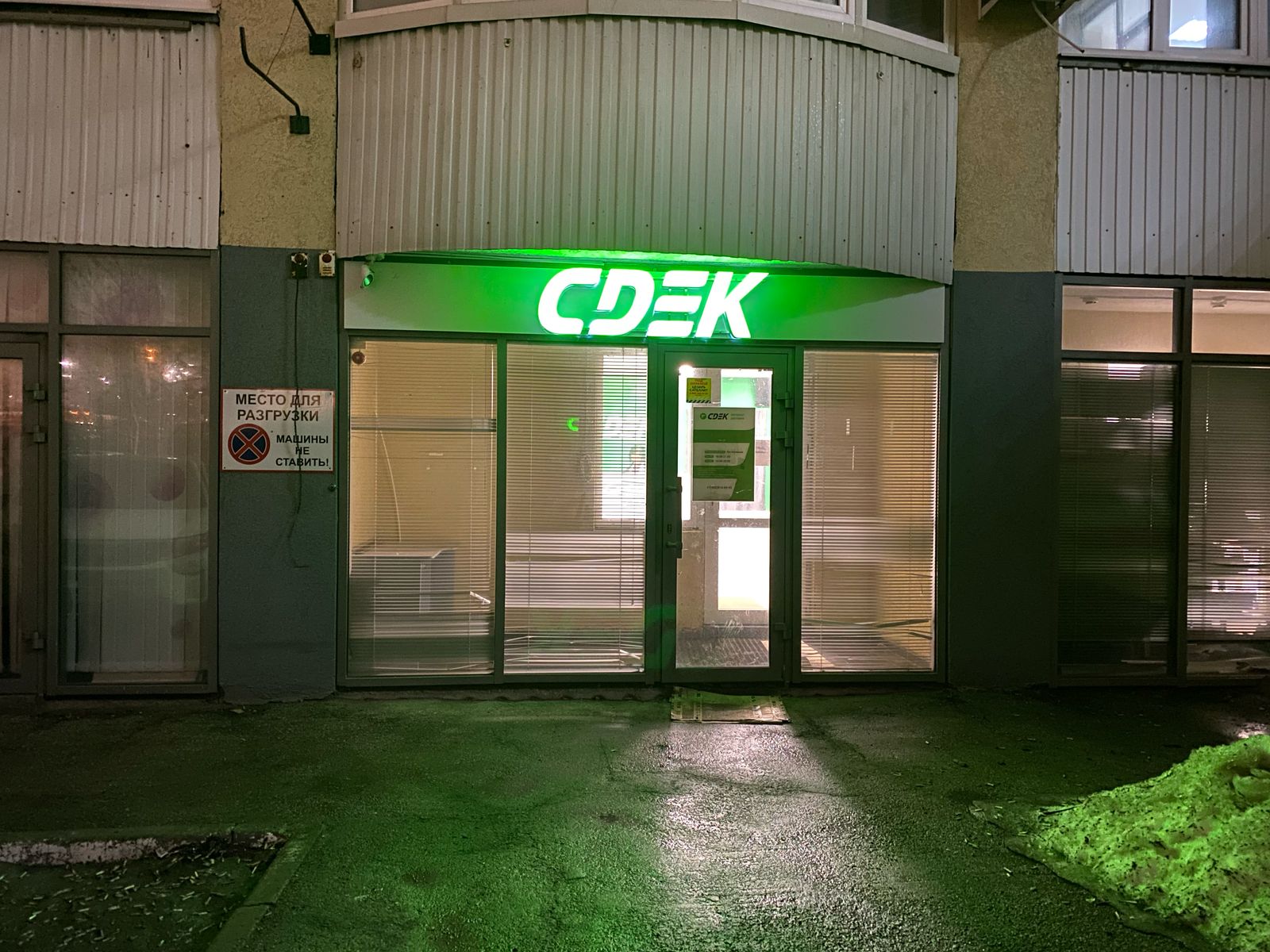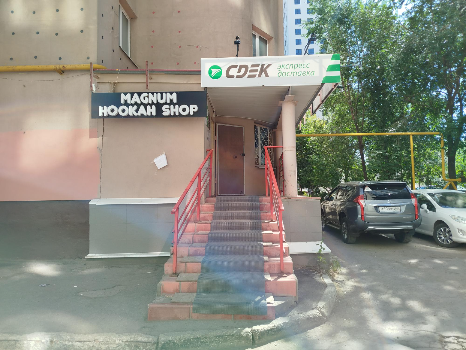Вход со стороны улицы Молодогвардейской. За рестораном ЧипоЛучо шлагбаум, далее второе крыльцо, над которым висит вывеска СДЭК.