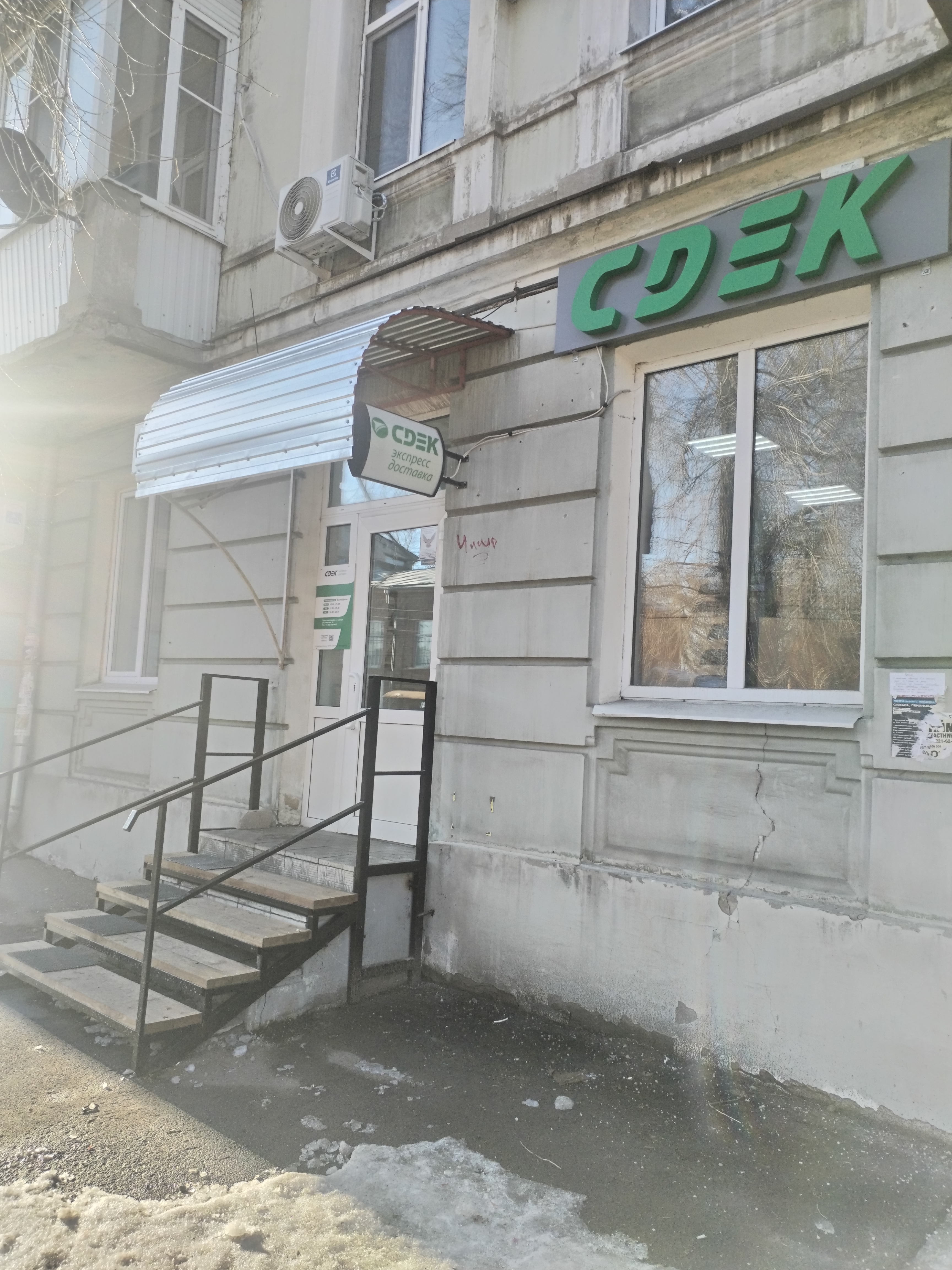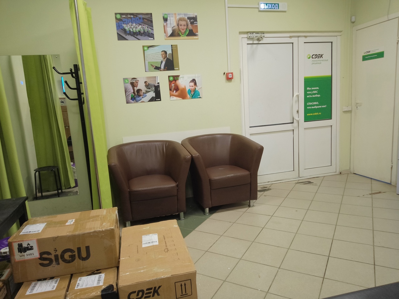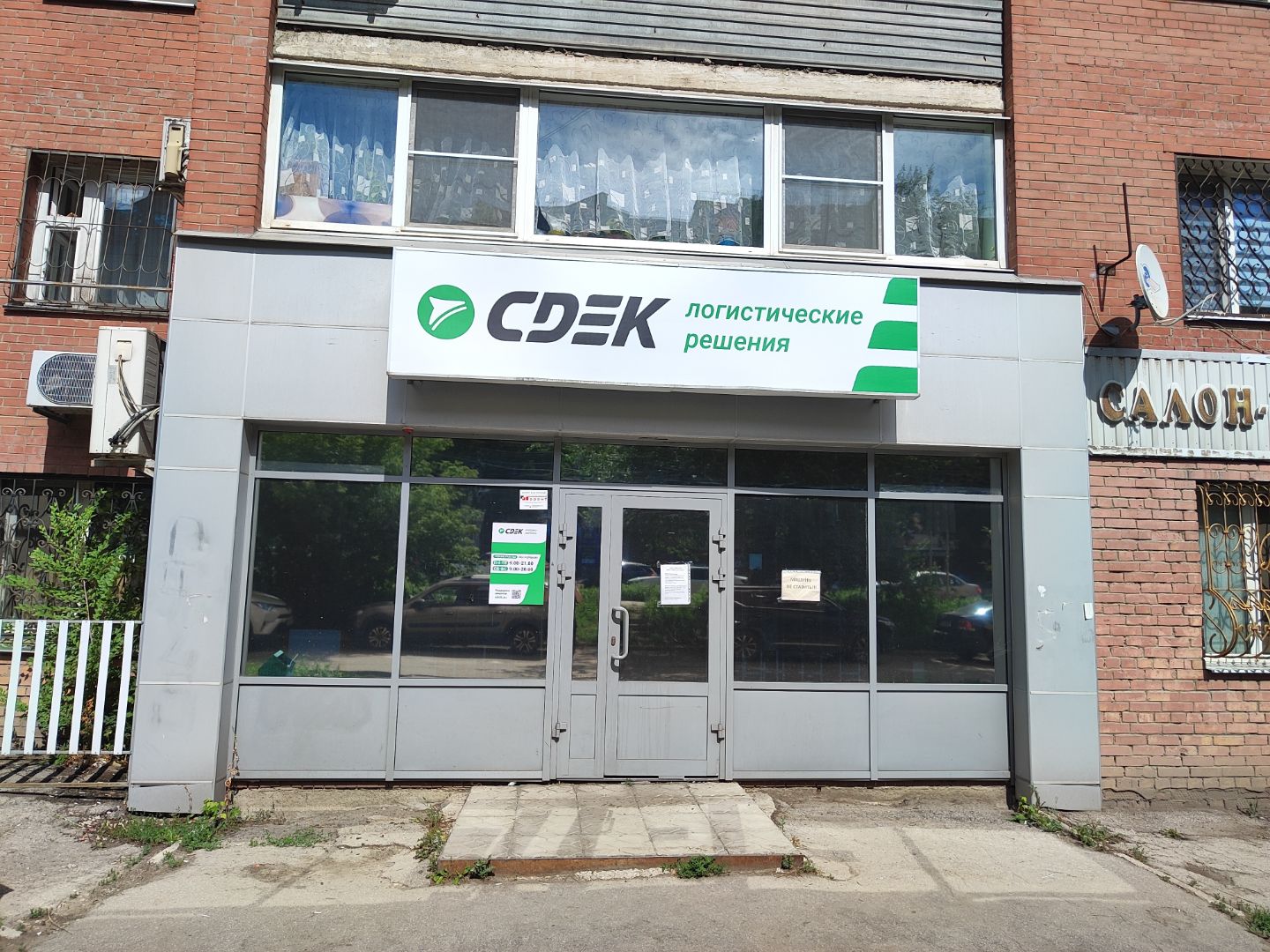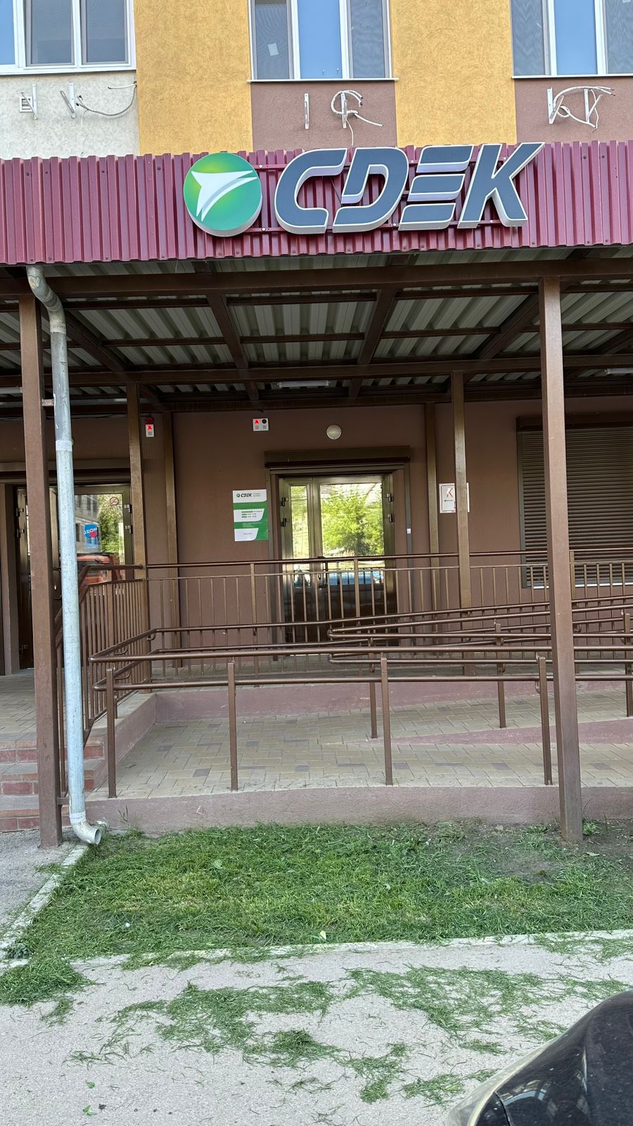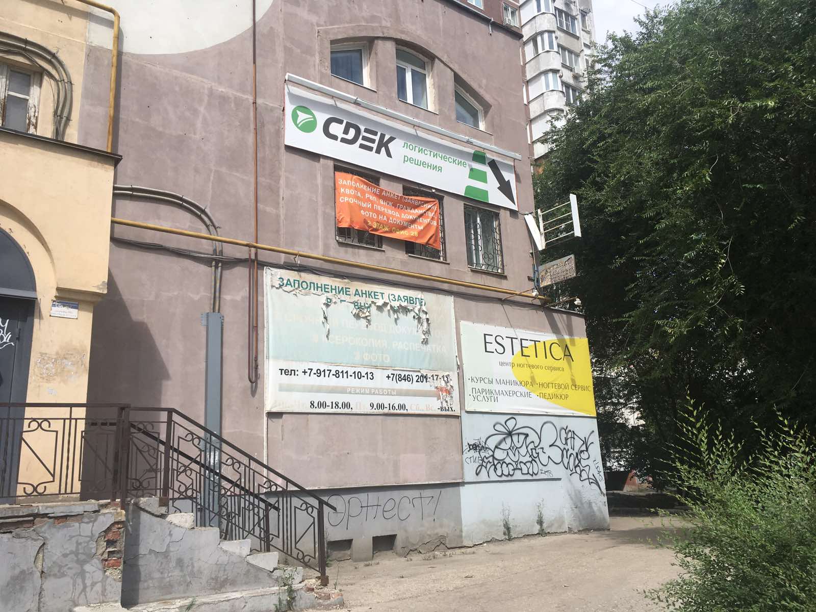 Вход со стороны улицы Молодогвардейской. За рестораном ЧипоЛучо шлагбаум, далее второе крыльцо, над которым висит вывеска СДЭК.