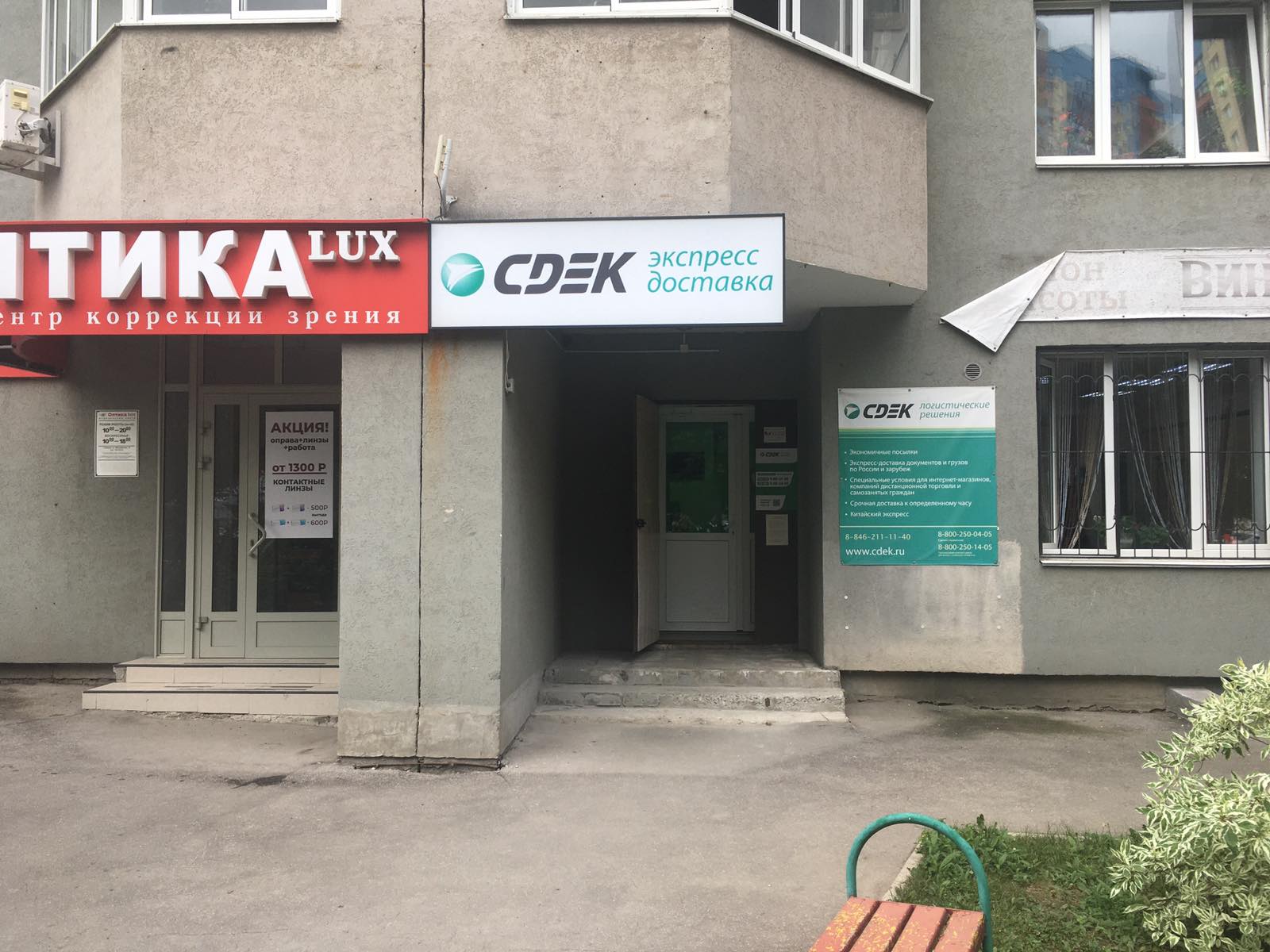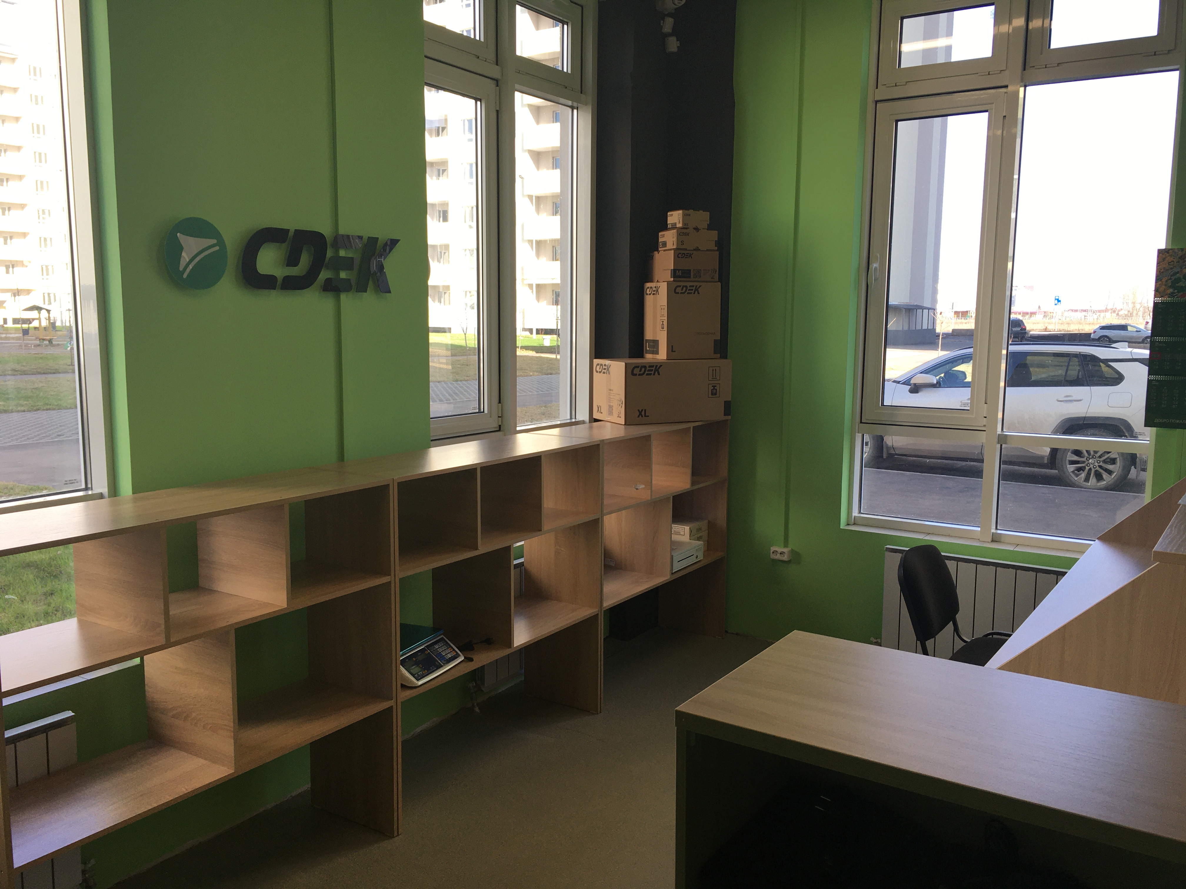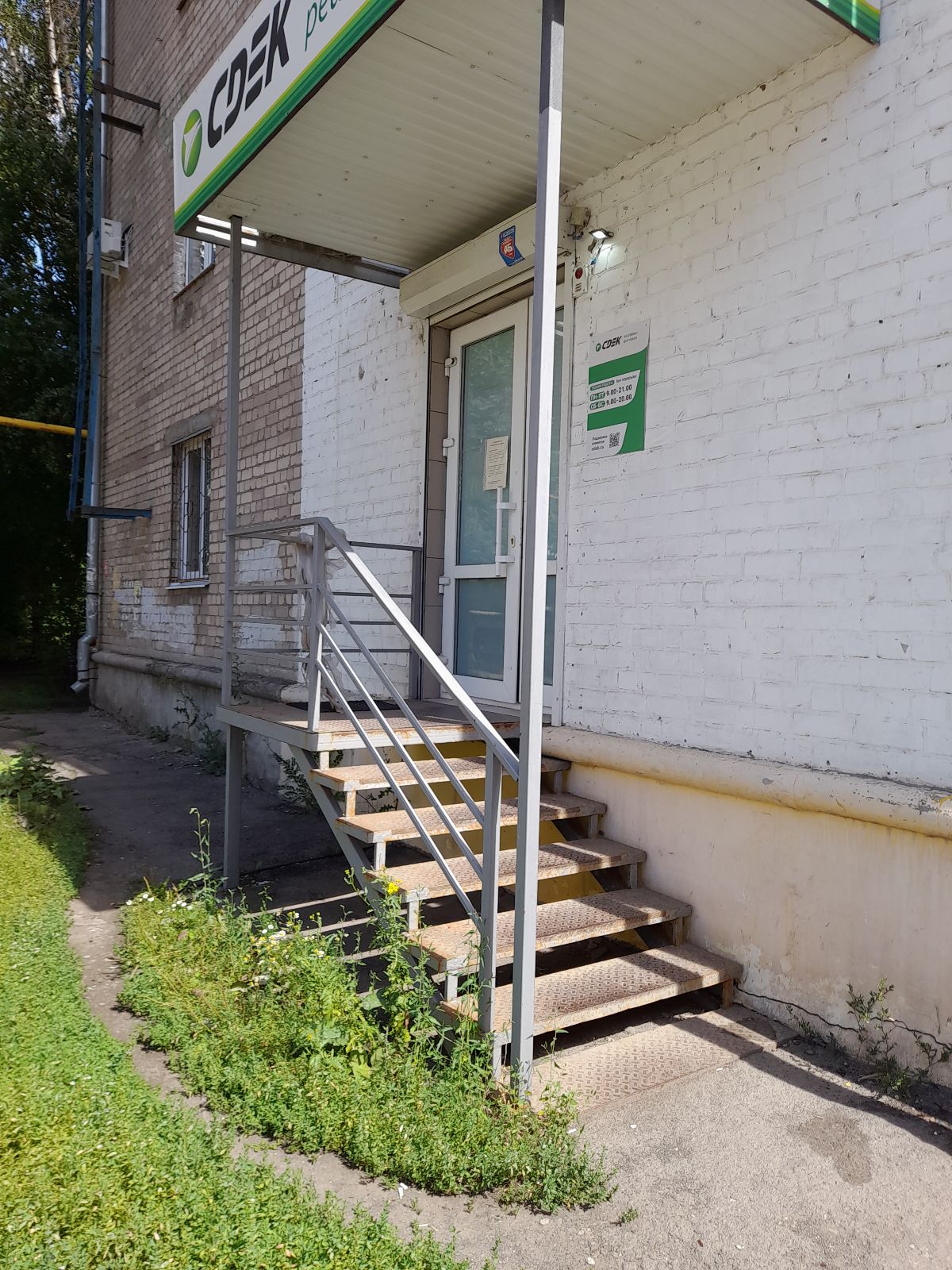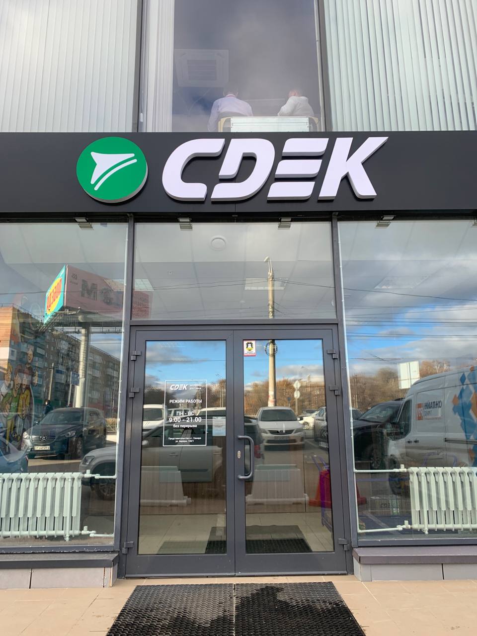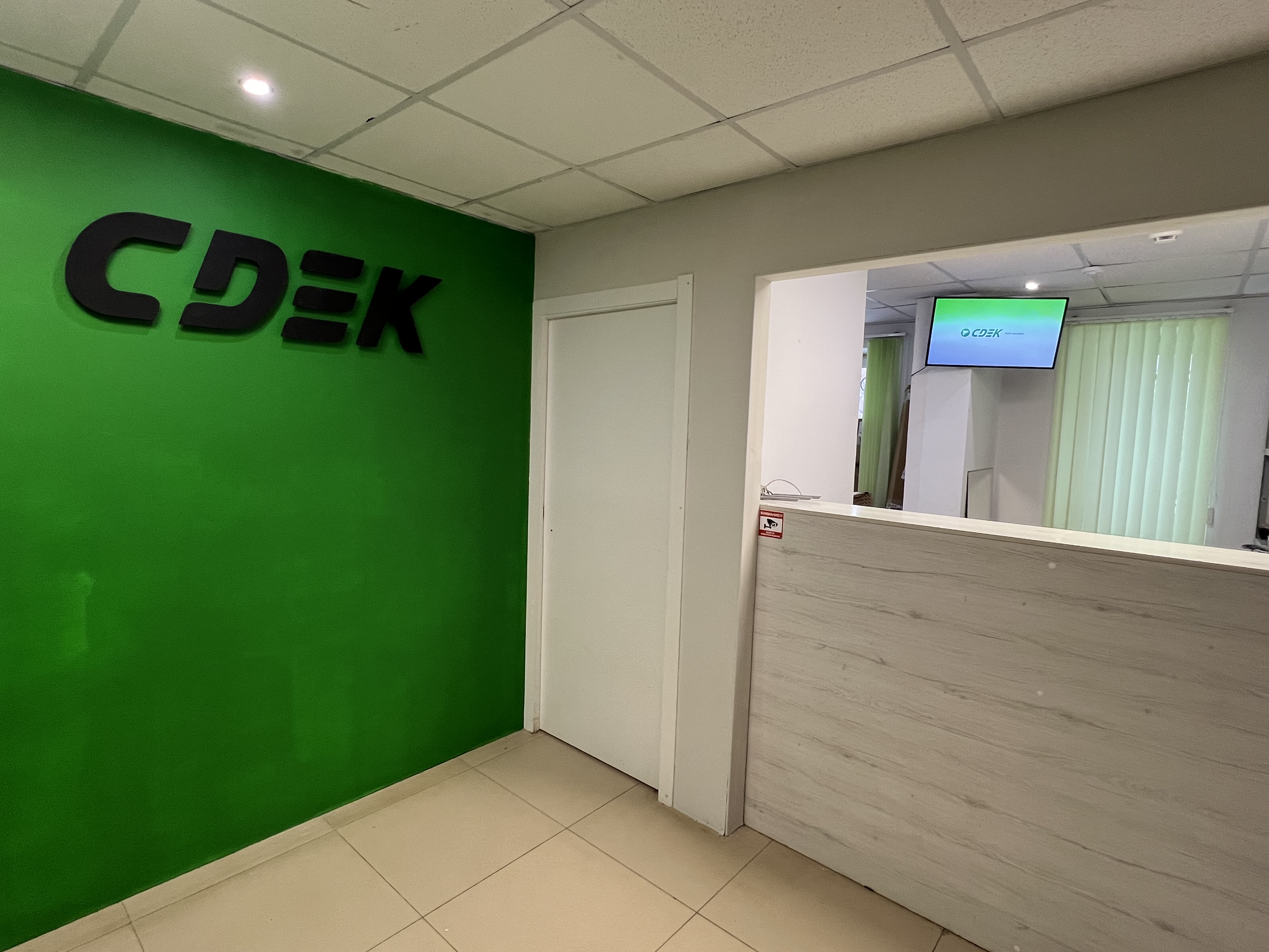 Вход со стороны улицы Молодогвардейской. За рестораном ЧипоЛучо шлагбаум, далее второе крыльцо, над которым висит вывеска СДЭК.