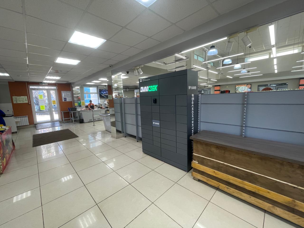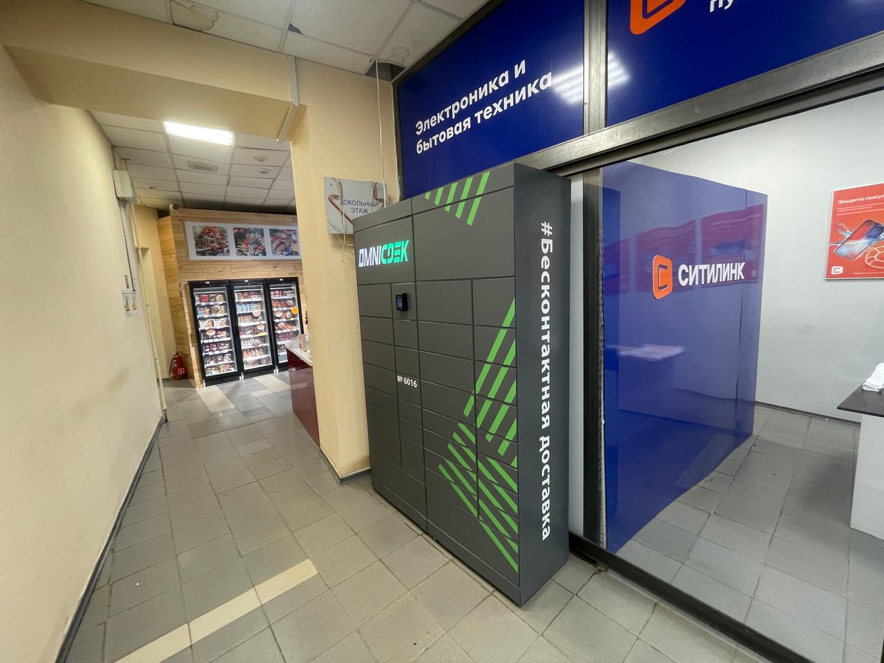 Войти в супермаркет Магнит через центральный вход, на 1 этаже около входа расположен постамат.