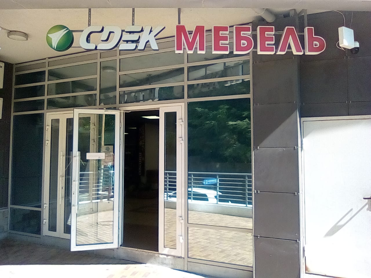 одноэтажное здание прилегающее к жилому жому., большая вывеска продукты