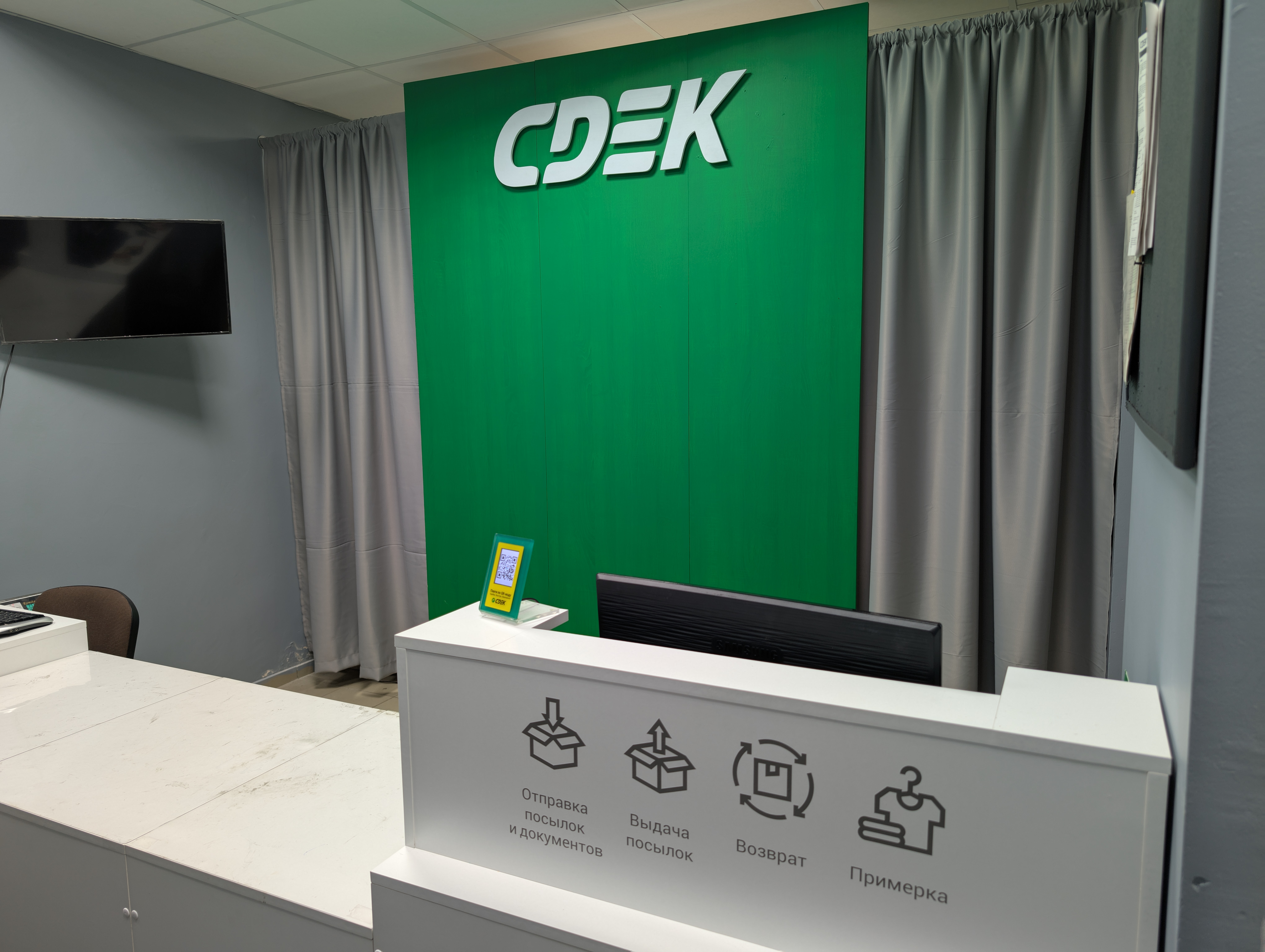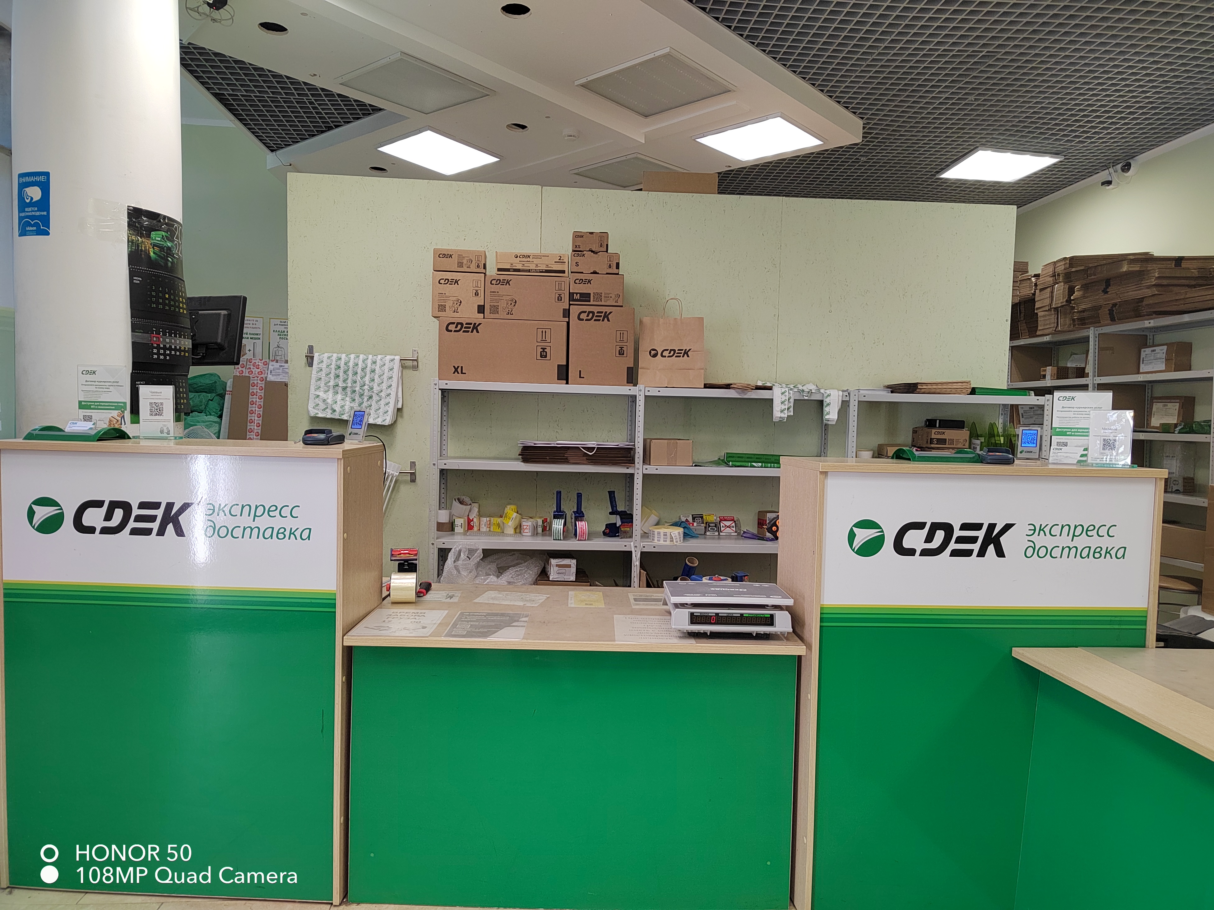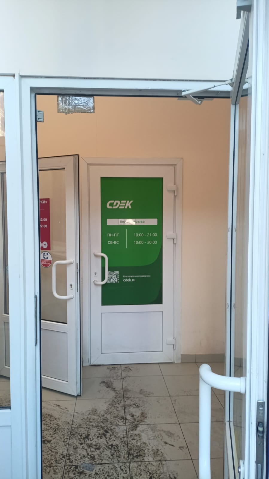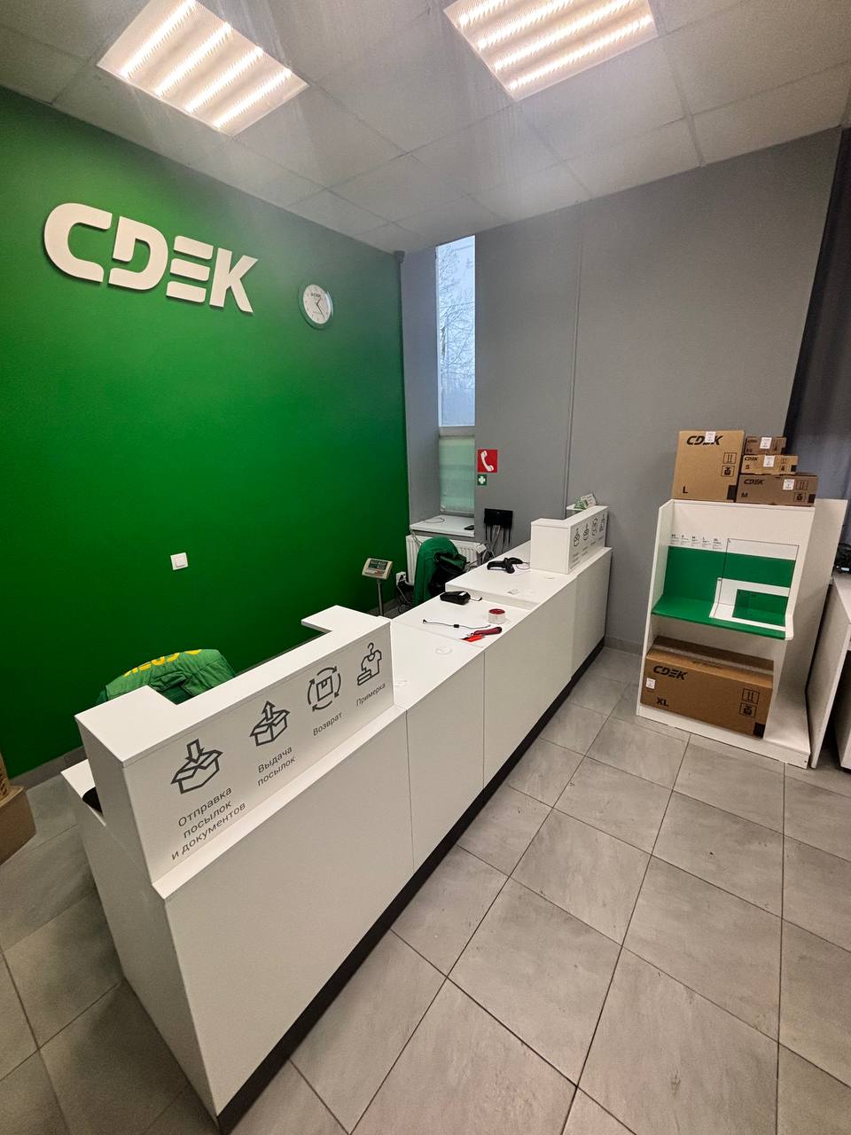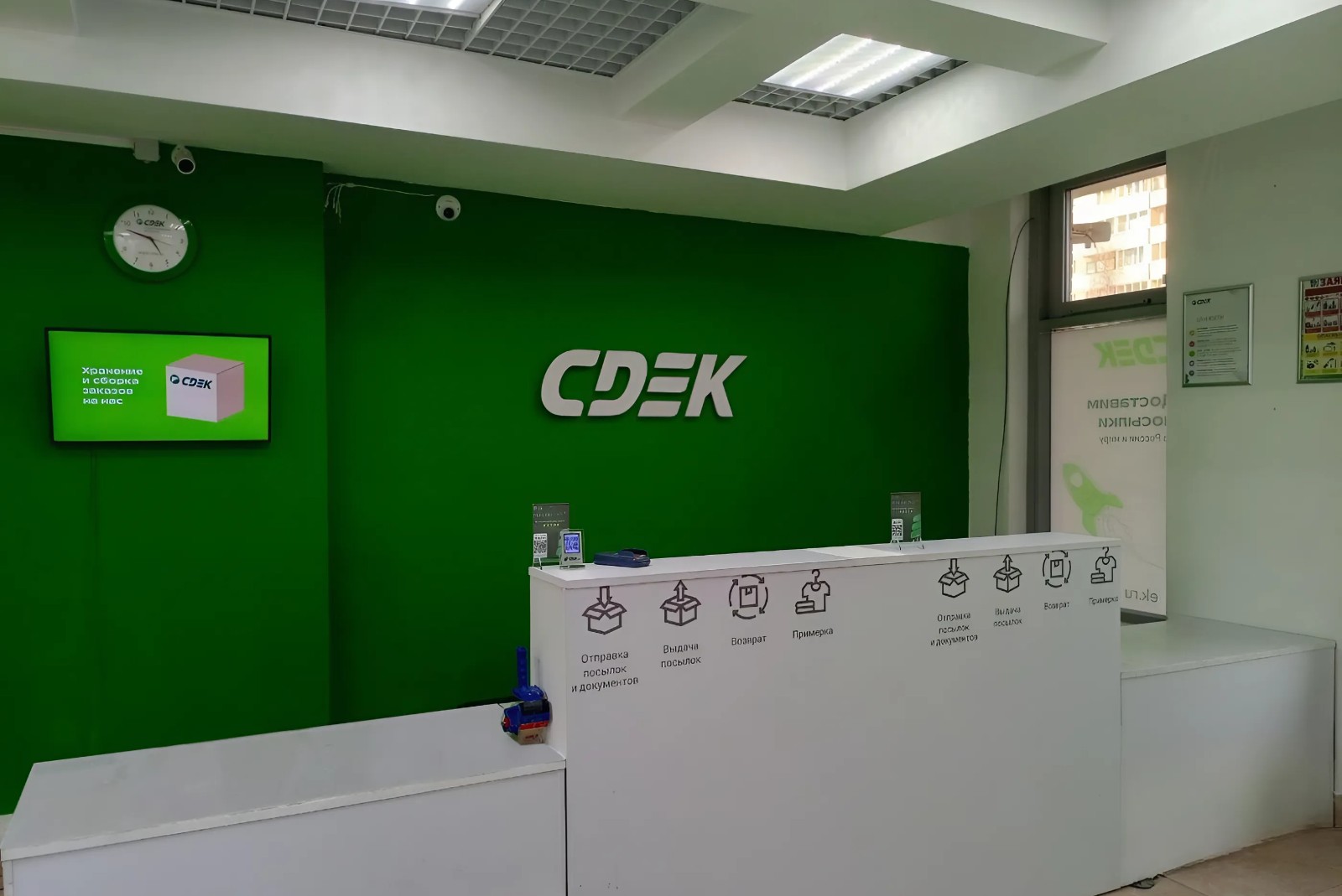 От автобусной остановки "Проспект Культуры", вниз, вдоль жилых домов по проспекту Культуры, у первого жилого дома - вывеска "CDEK".