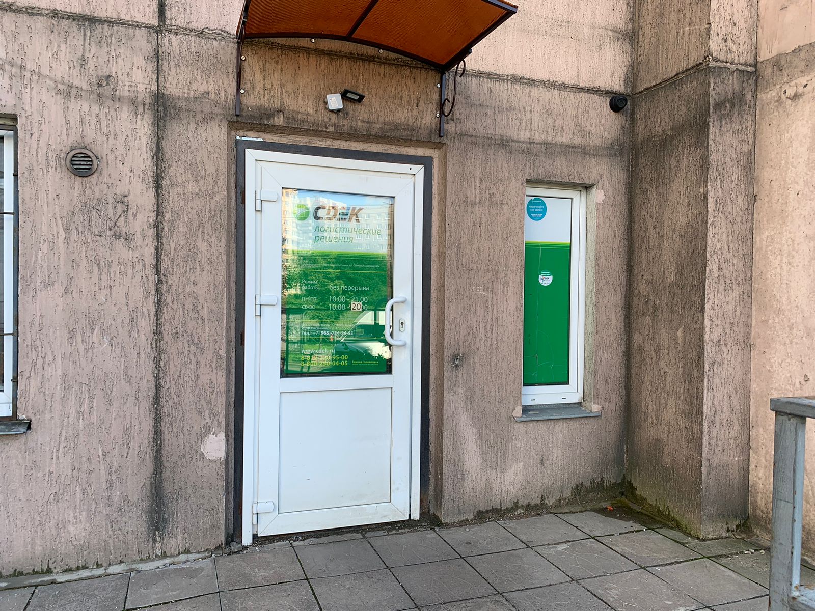 Двухэтажное здание рядом с остановкой общественного транспорта «Пискаревский проспект». Вход с Полюстровского проспекта.
