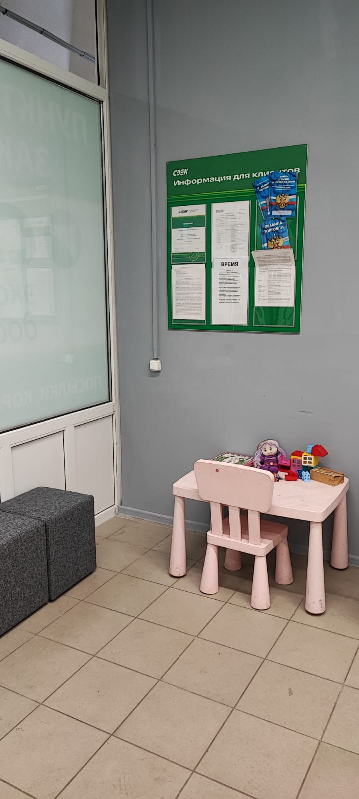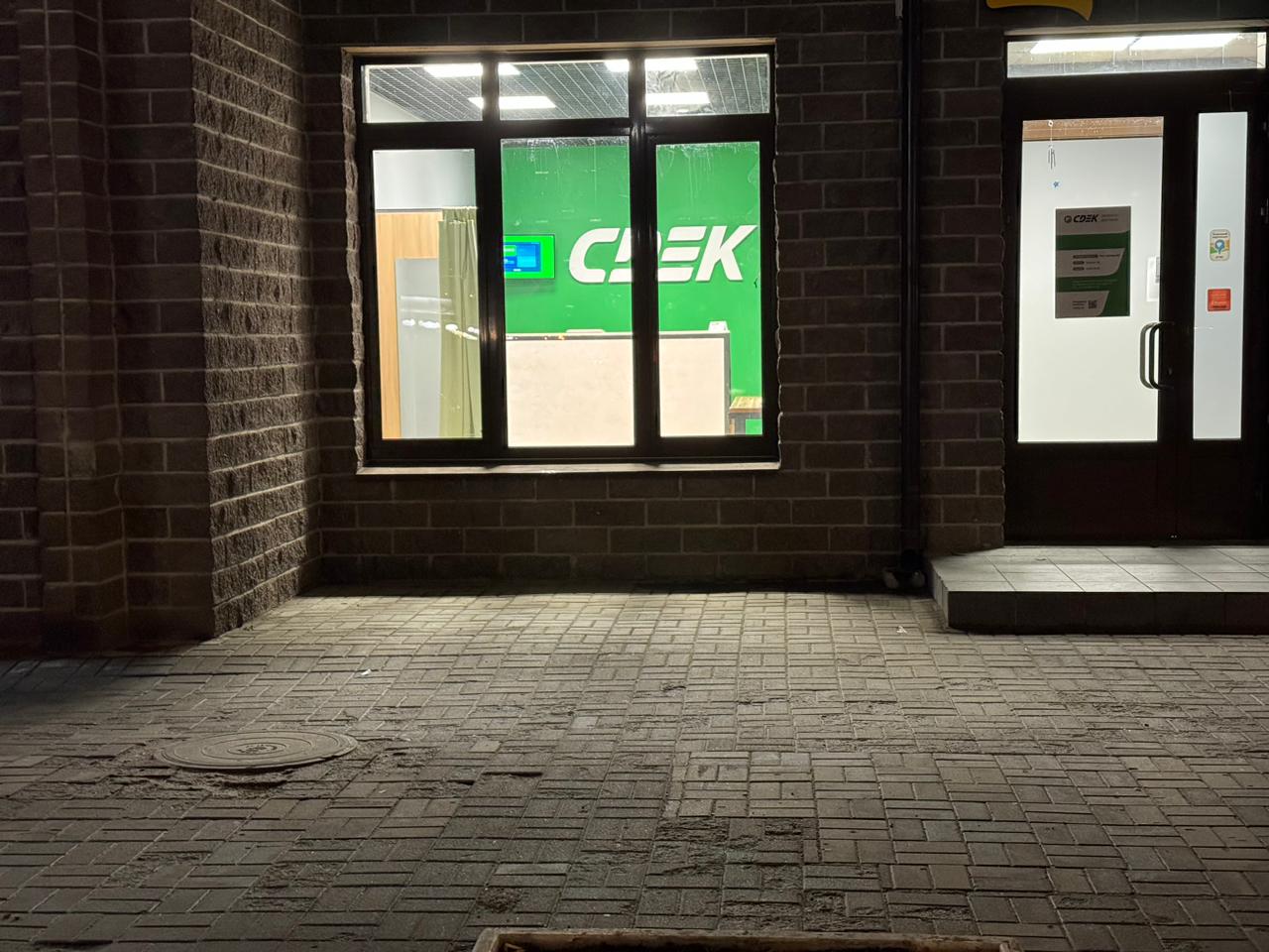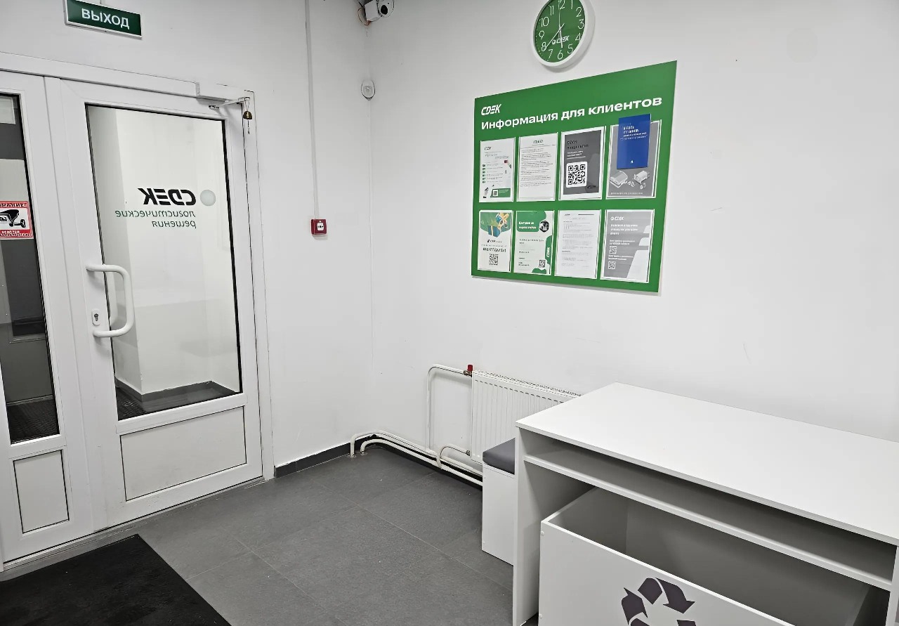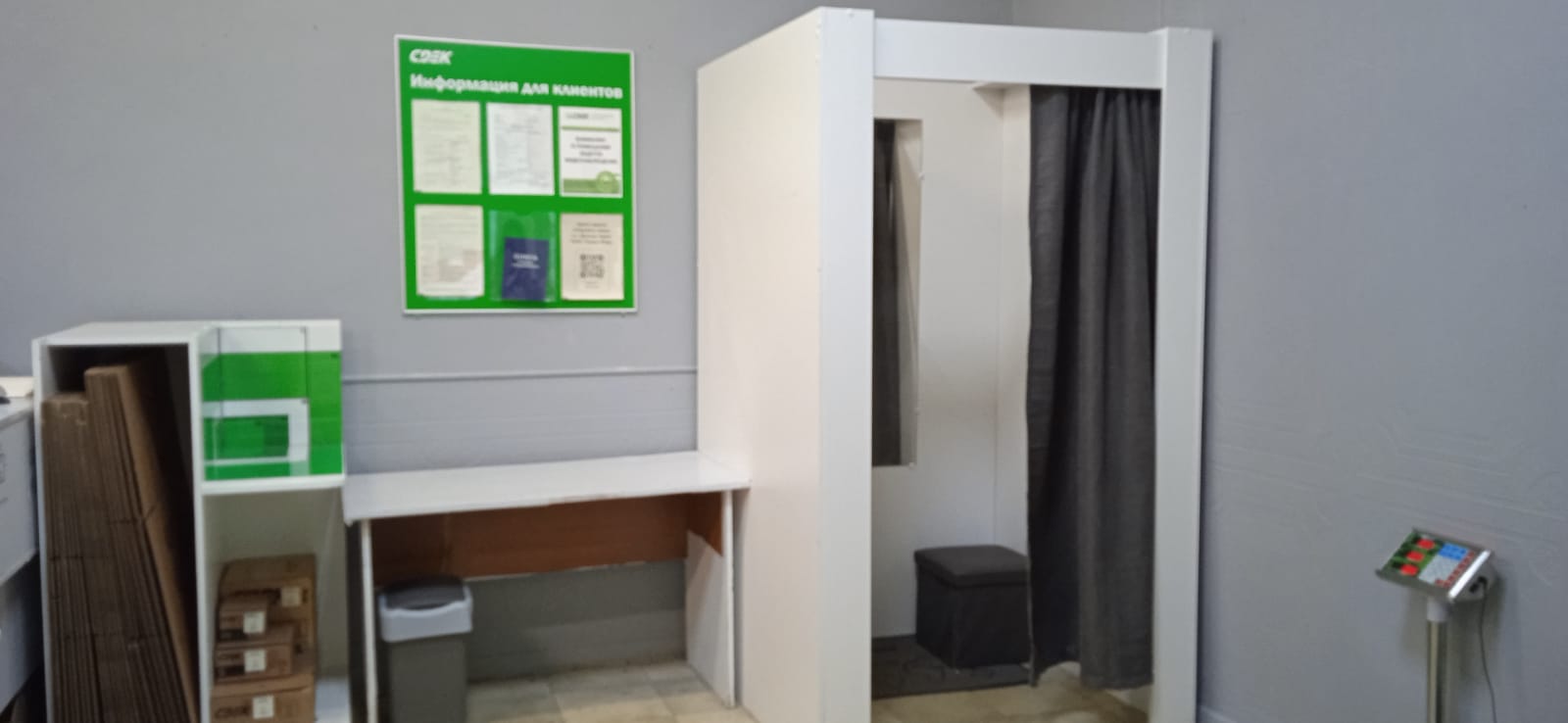 Войти в отделение банка Совкомбанк через центральный вход, на 1 этаже расположен постамат.