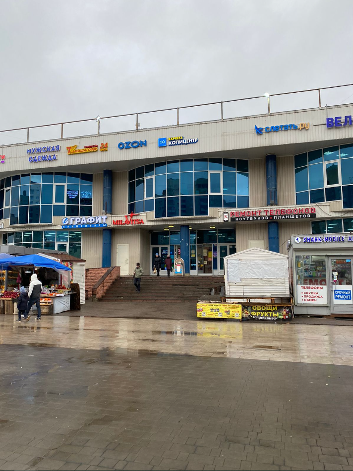 Выйдя из метро повернуть налево, пройти на площадь, со стороны площади будет вход в трёхэтажное здание, левее центрального входа вывеска «Базарофф», пройти 20 метров по территории рынка и по