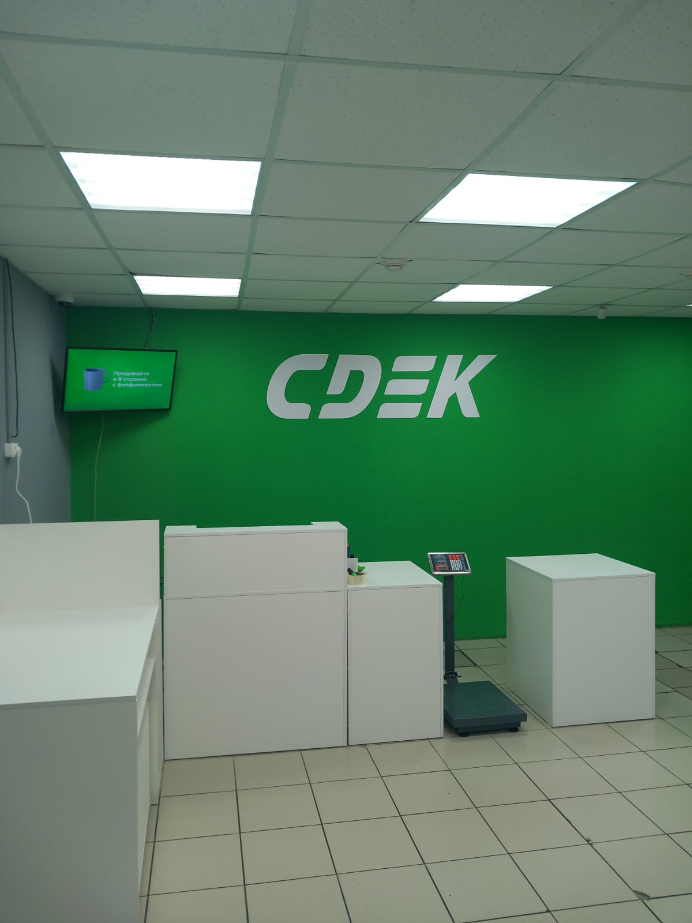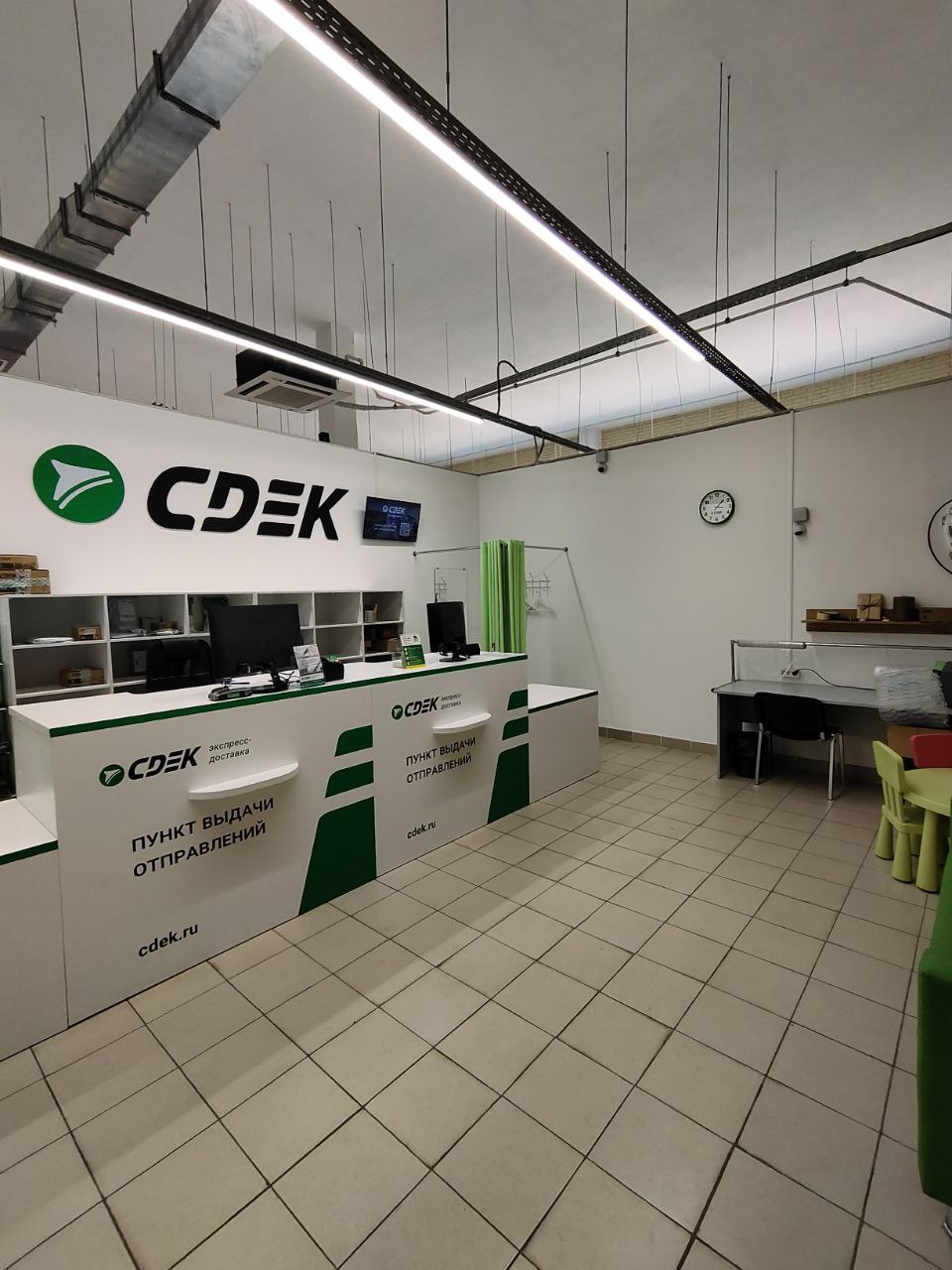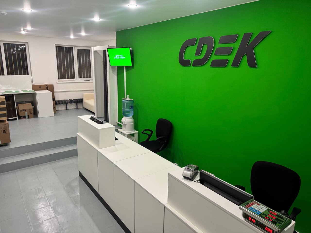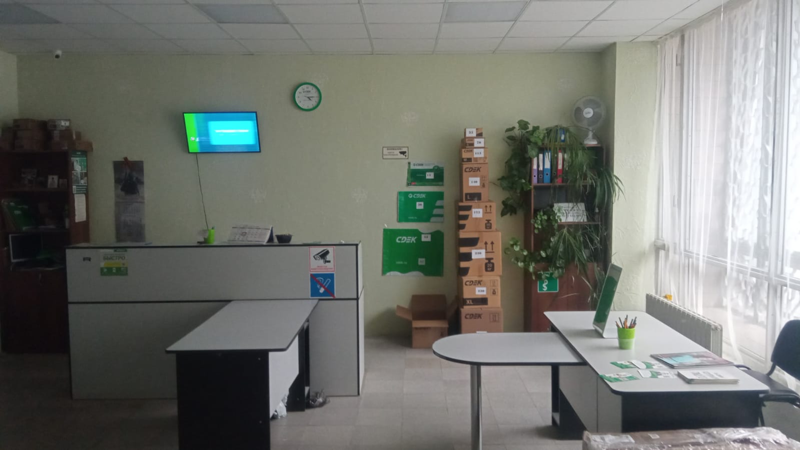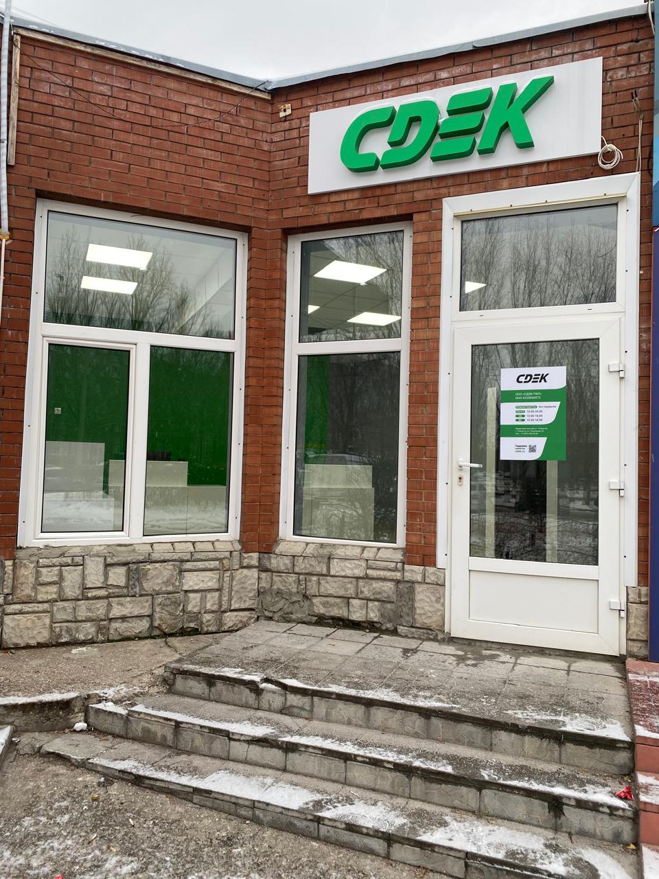 Слева видим ТЦ «Офис 44», здание с большим рекламным баннером на торце здания. Слева от входа большой банер «СДЭК Логистические решения»