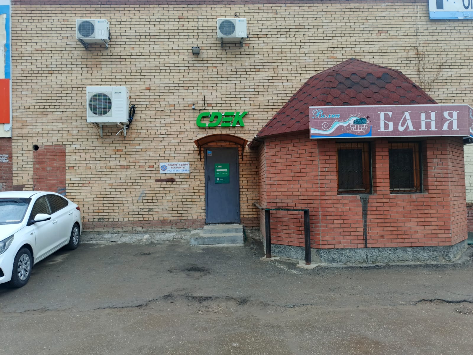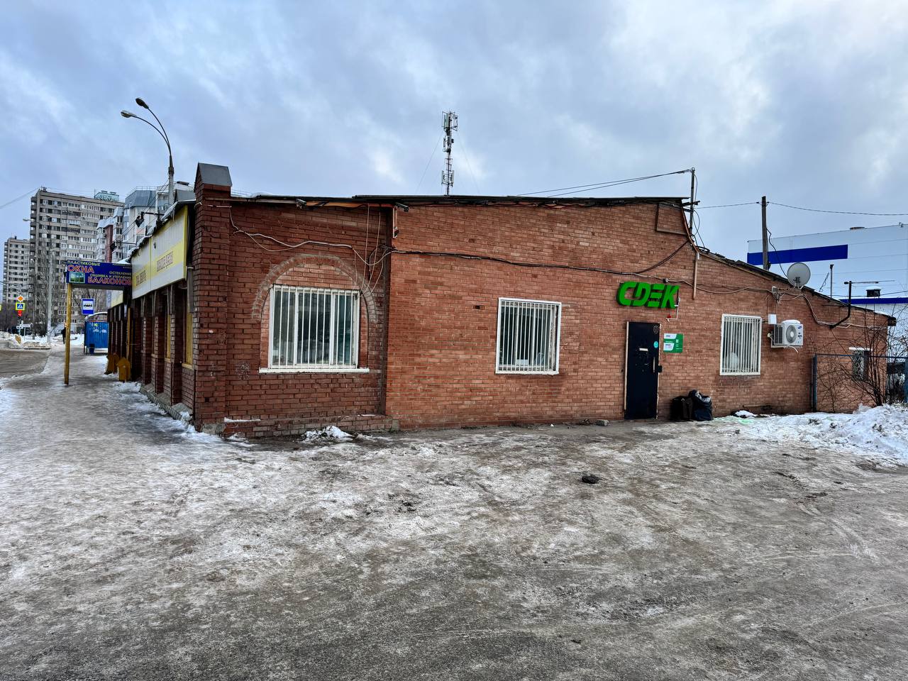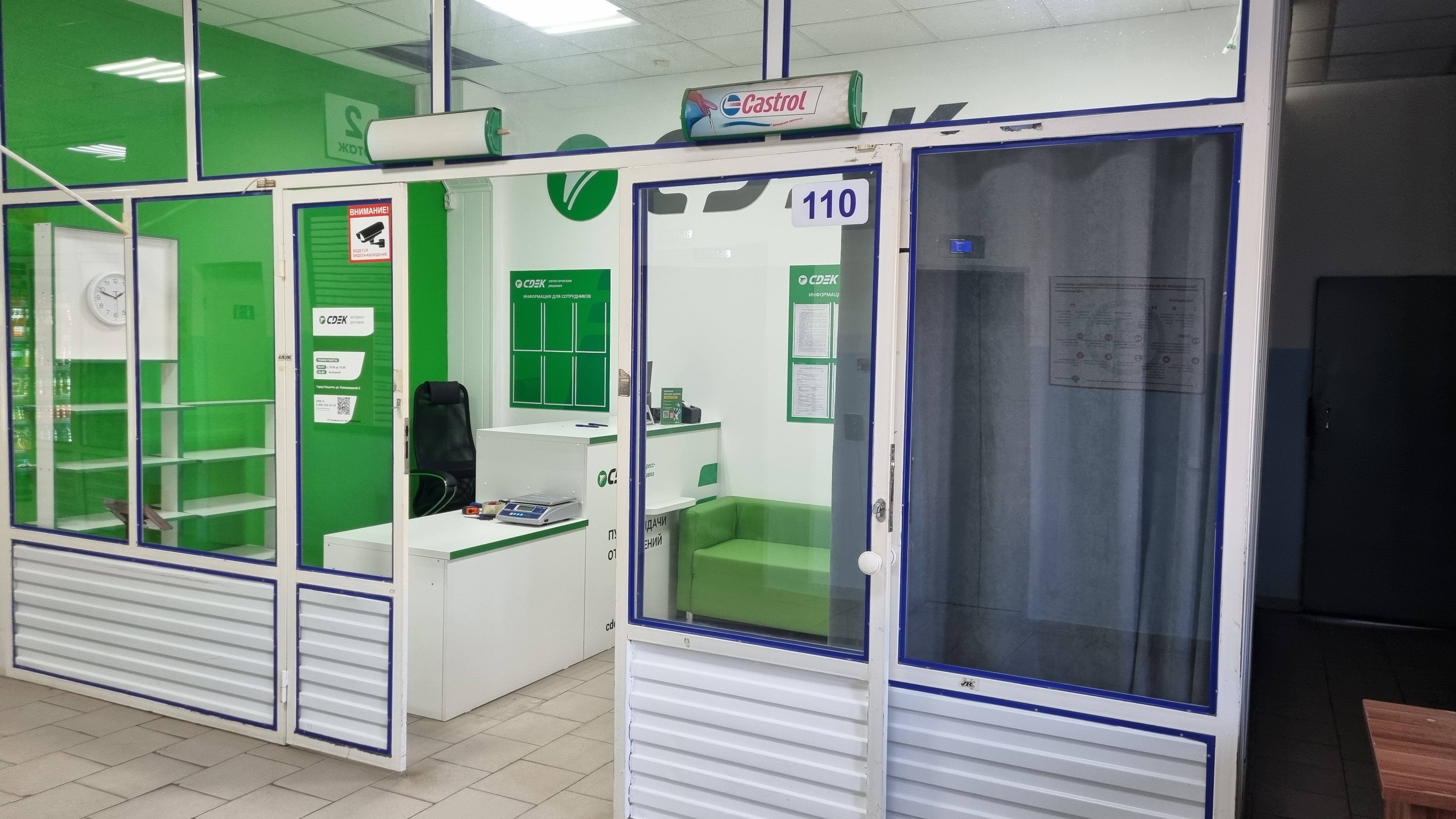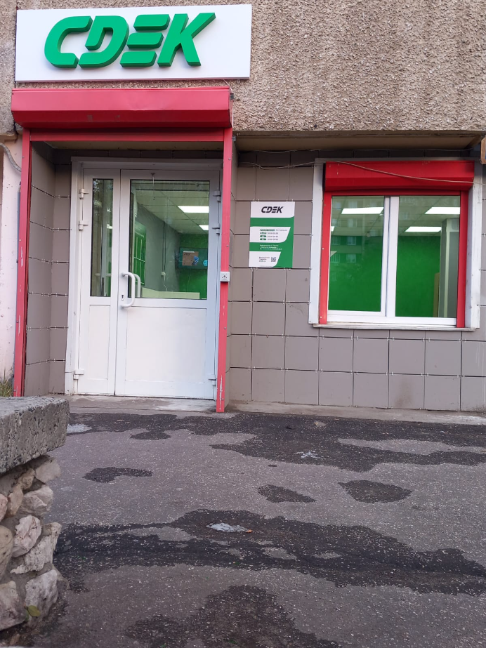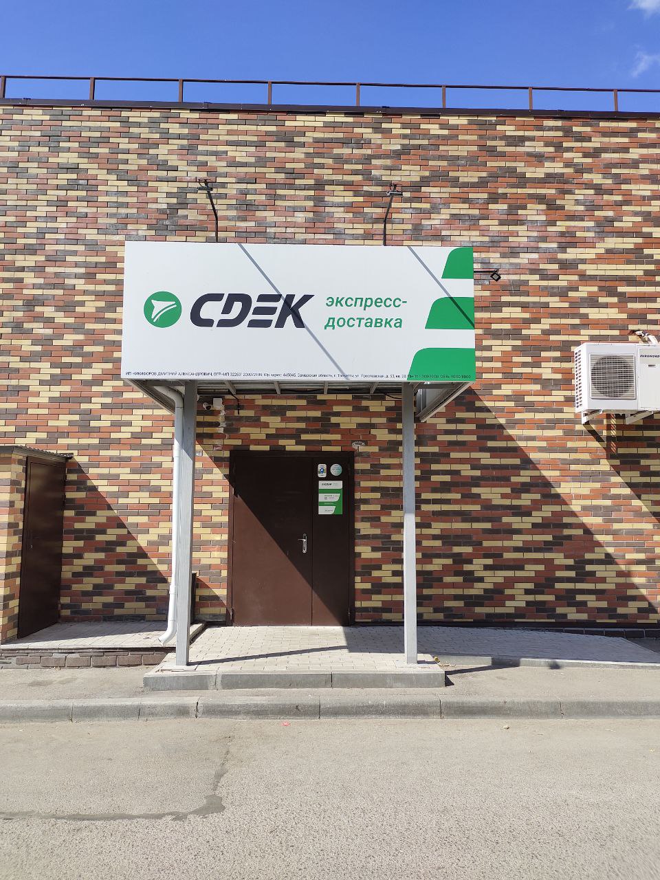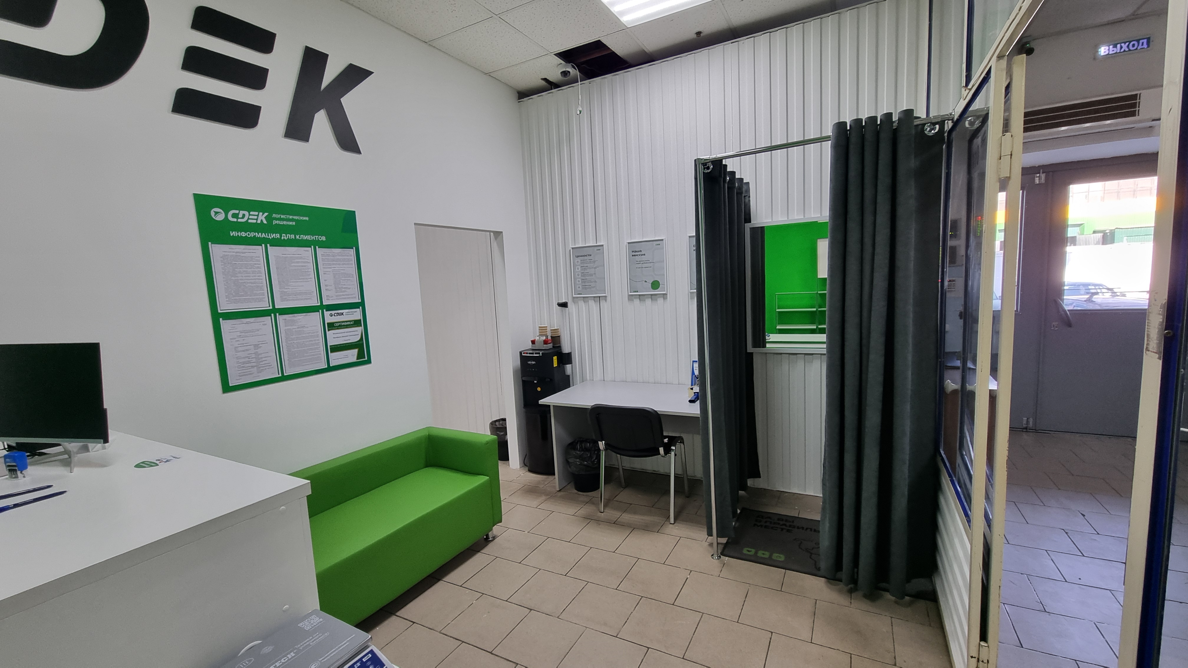 Слева видим ТЦ «Офис 44», здание с большим рекламным баннером на торце здания. Слева от входа большой банер «СДЭК Логистические решения»