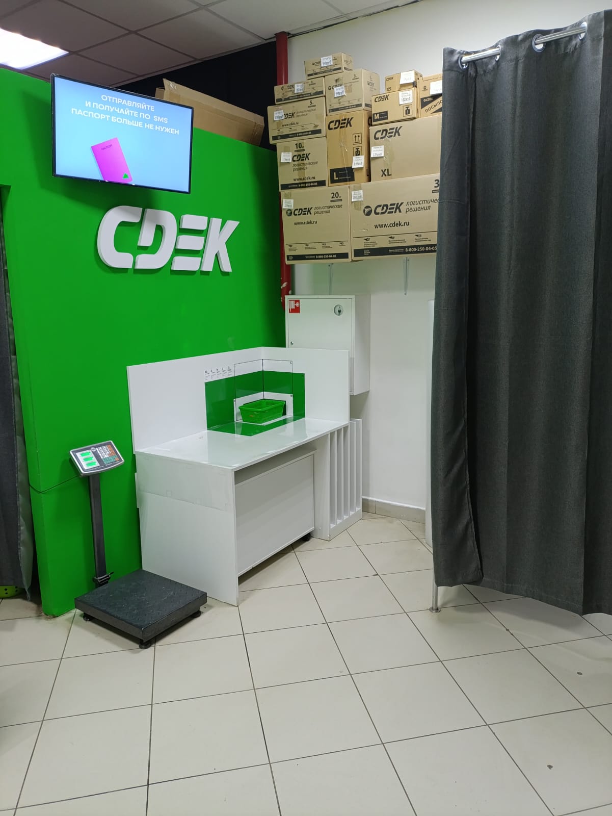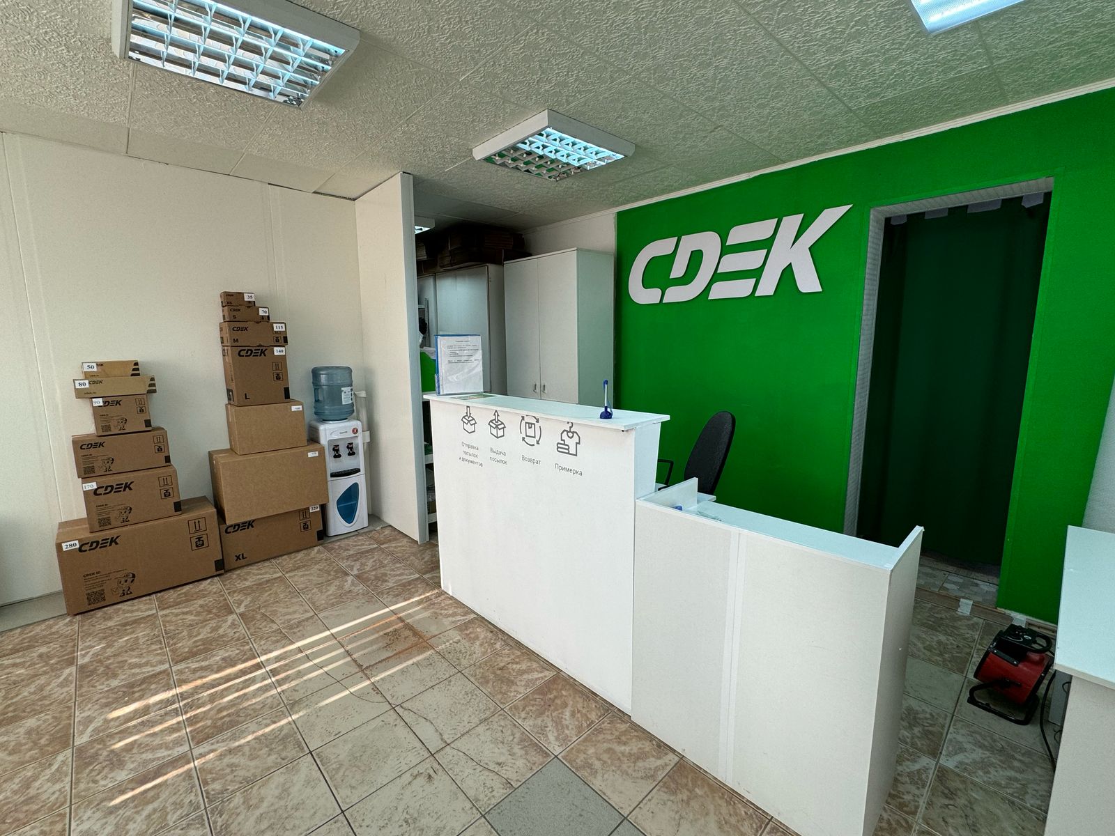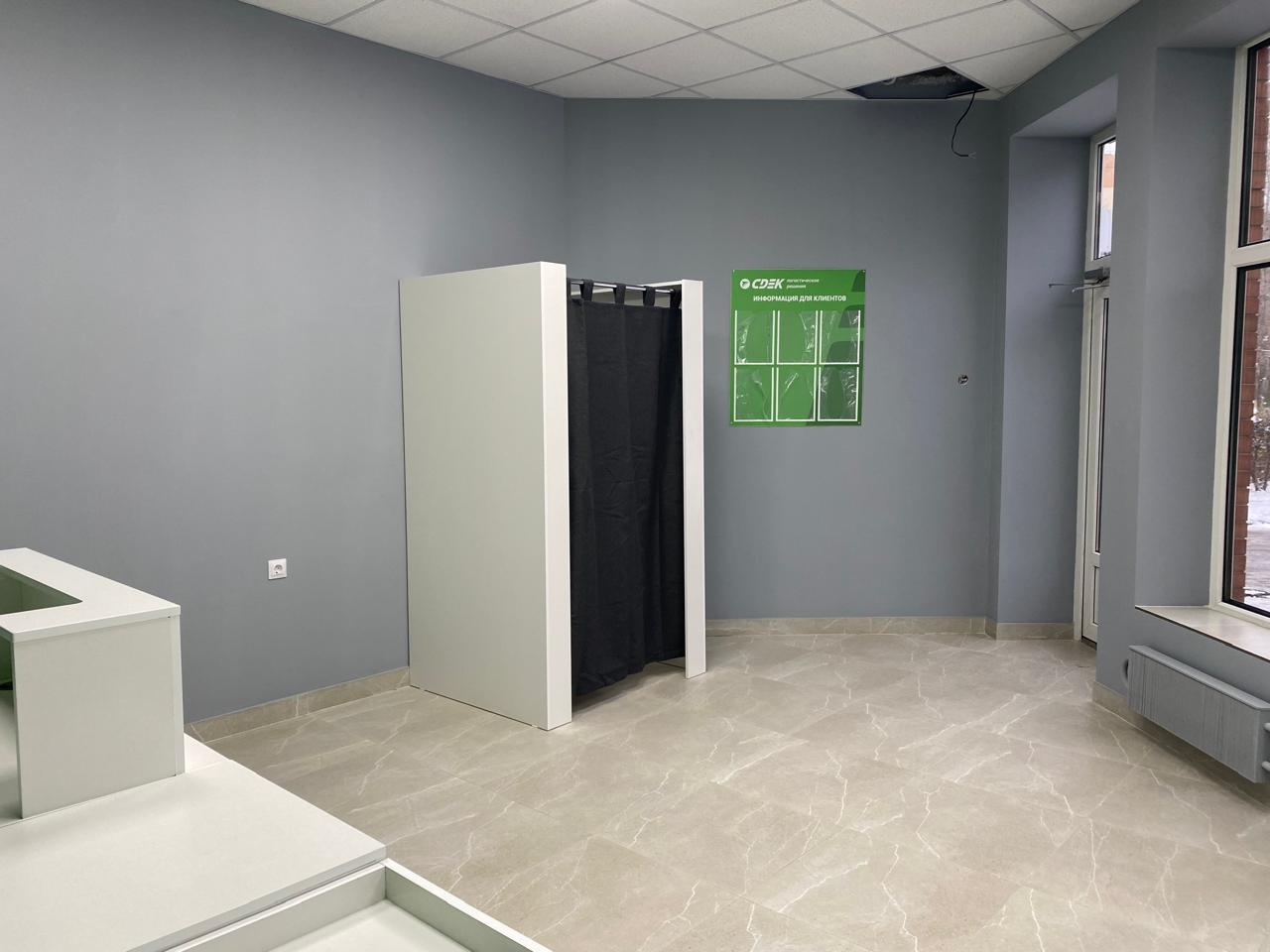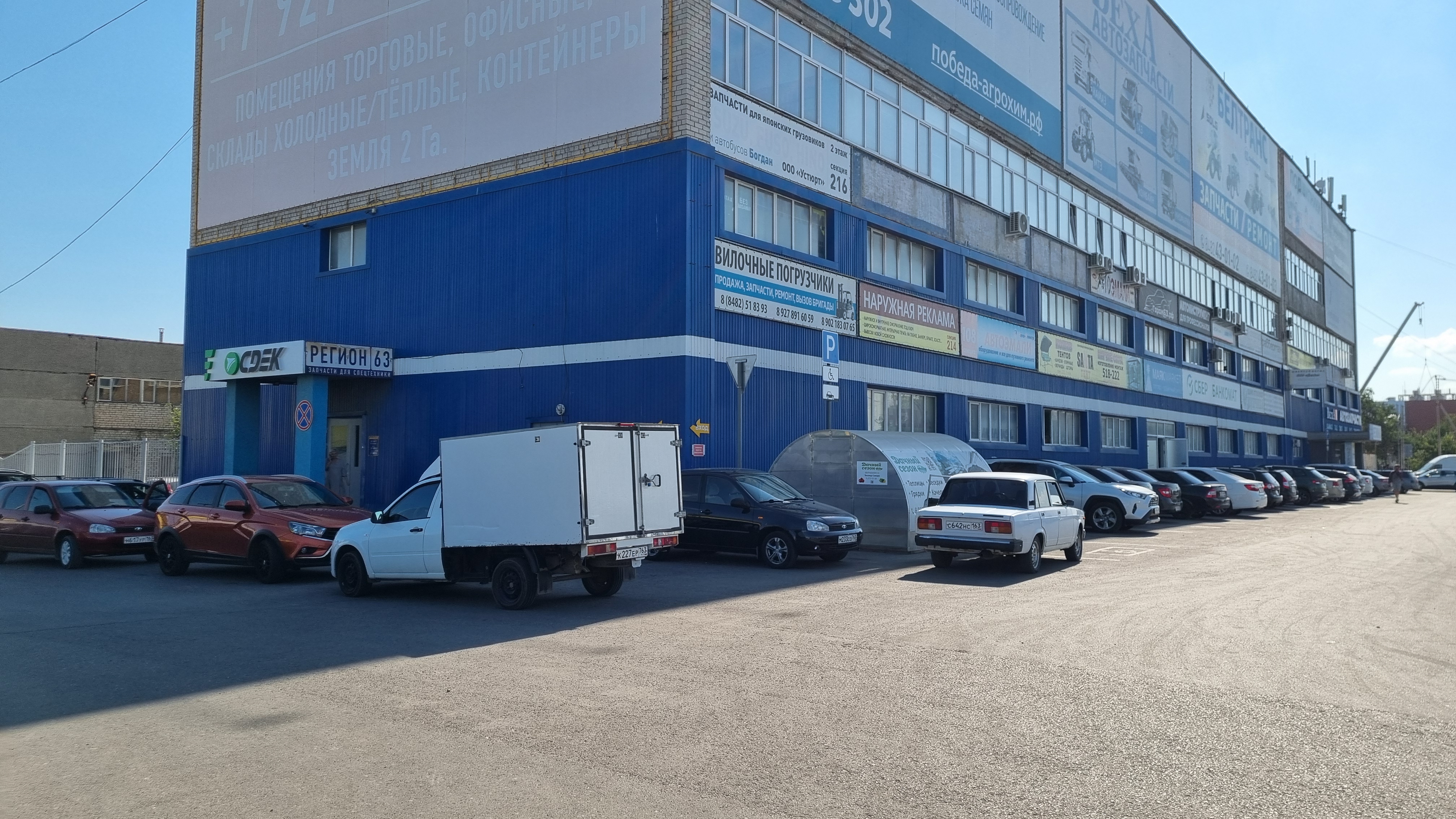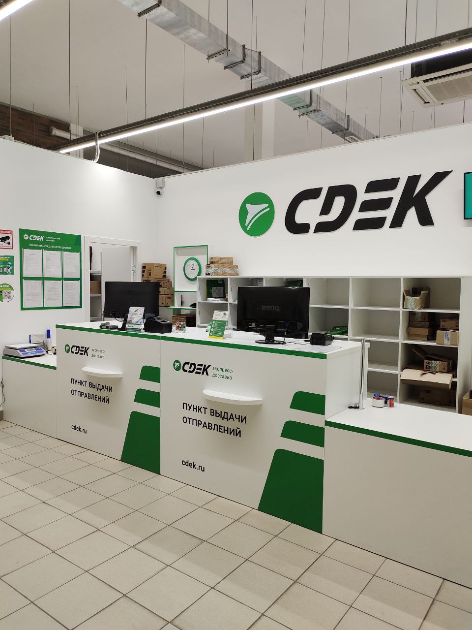 Слева видим ТЦ «Офис 44», здание с большим рекламным баннером на торце здания. Слева от входа большой банер «СДЭК Логистические решения»