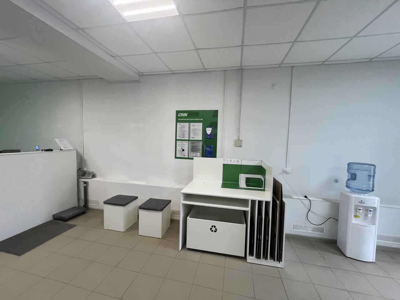 Войти в отделение банка Совкомбанк через центральный вход, на 1 этаже расположен постамат