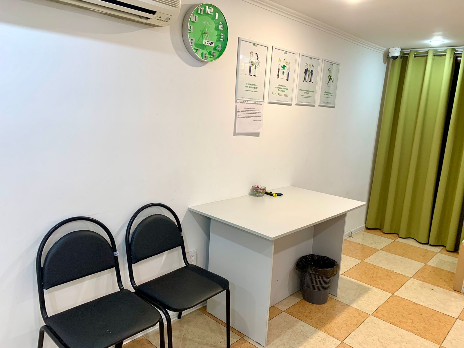 От остановки "Солнечная", 30м в направлении магазина «Магнит». На общем перекрестке, через дорогу одноэтажное здание с правой стороны, перед отелем «Звездный»