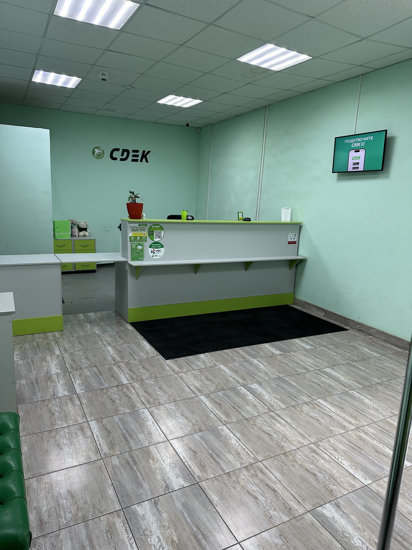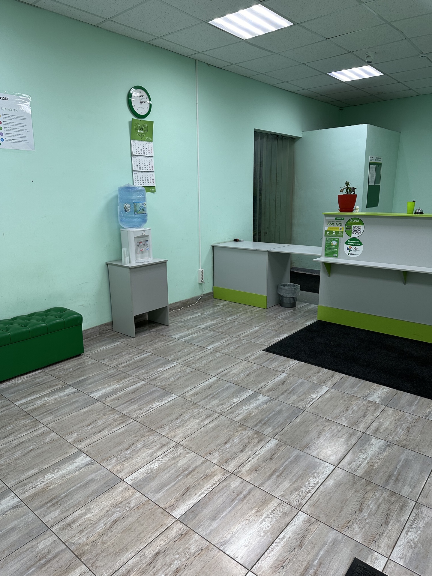 Войти в отделение банка Совкомбанк через центральный вход, на 1 этаже расположен постамат